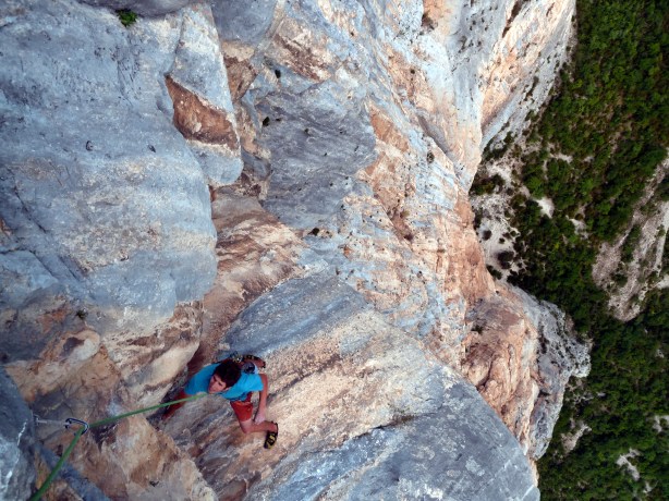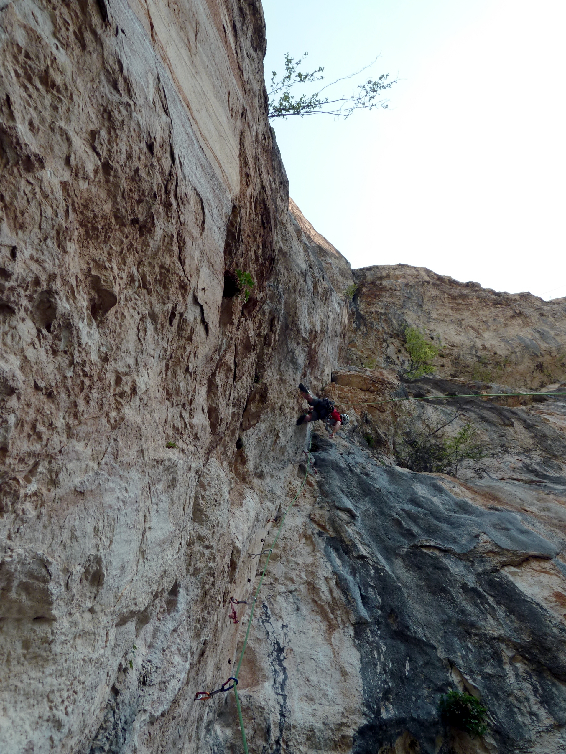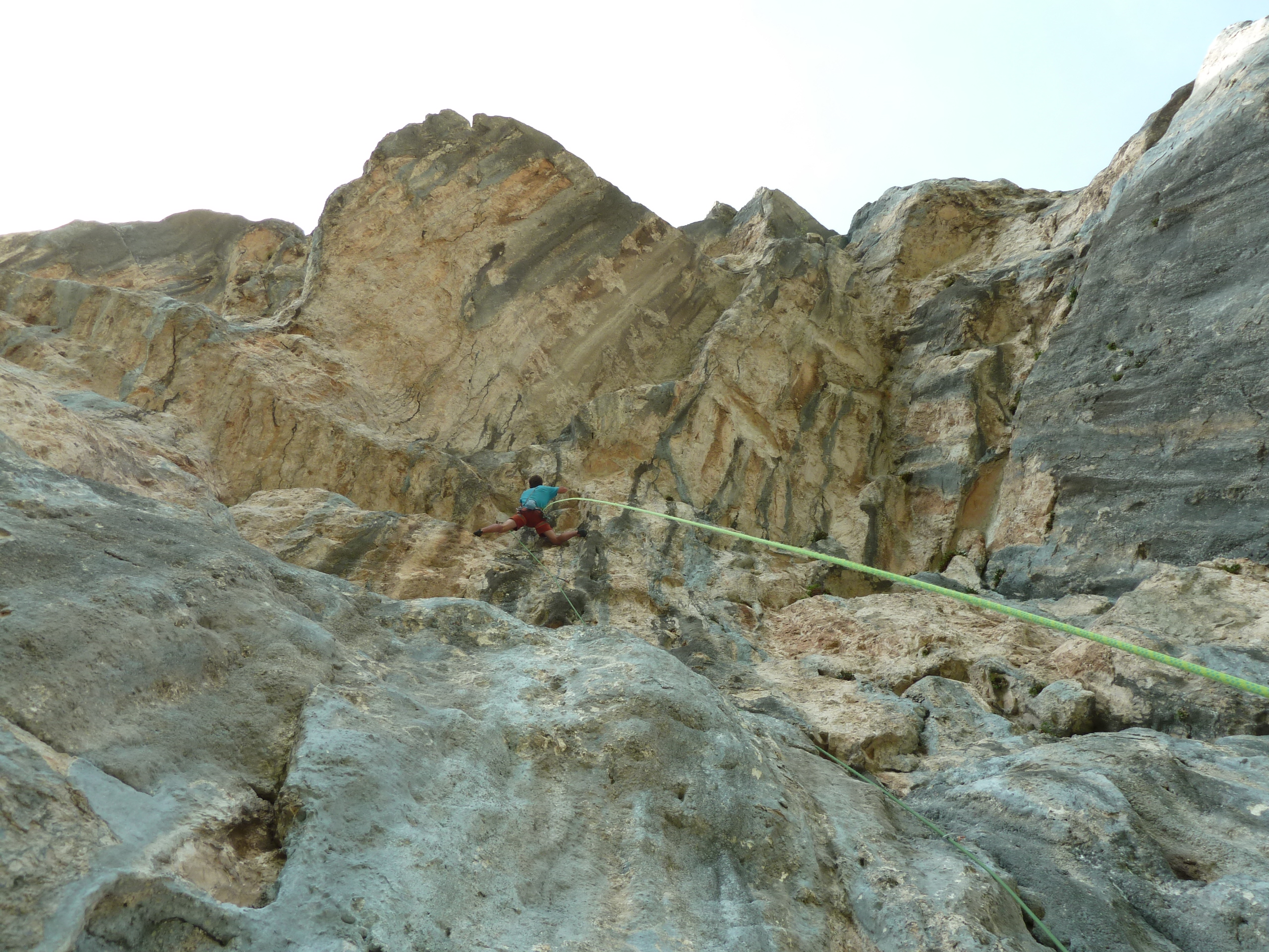 L2 : 7b+, 35m. Section difficile au dessus du relais puis grande fissure déversante assez physique et très continue (belle ambiance).