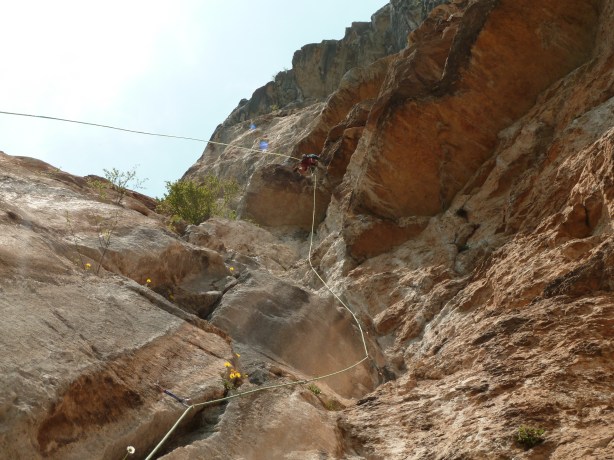L5 : 5+, 50m. Ne pas monter droit au dessus du relais (plaquettes grises) mais descendre un peu (2m, arbuste) pour rejoindre la dalle à gauche et ensuite passer le pilier pour rejoindre le relais dans le dièdre.