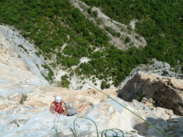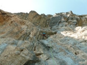 L11 : 4, 30m. Monter droit au dessus du relais pour rejoindre un relais pas loin du câble de descente (terrasse). Deux ou trois pitons dans cette longueur un peu instable.