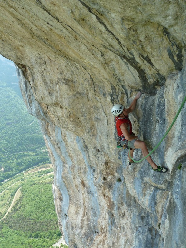 Située en plein milieu du triangle de Choranche (falaise de Presles), cette voie imaginée par Mussato passe là où le dévers est le plus prononcé. La première partie emprunte la vielle voie d’artif de « Deux âges« , une fissure déverssante sur 4 longueurs (30m de dévers) puis à la sortie du toit on traverse 50m à gauche pour continuer par la variante de sortie « Trois chevaux » équipée par Mussato (5 longueurs et 10m de dévers).