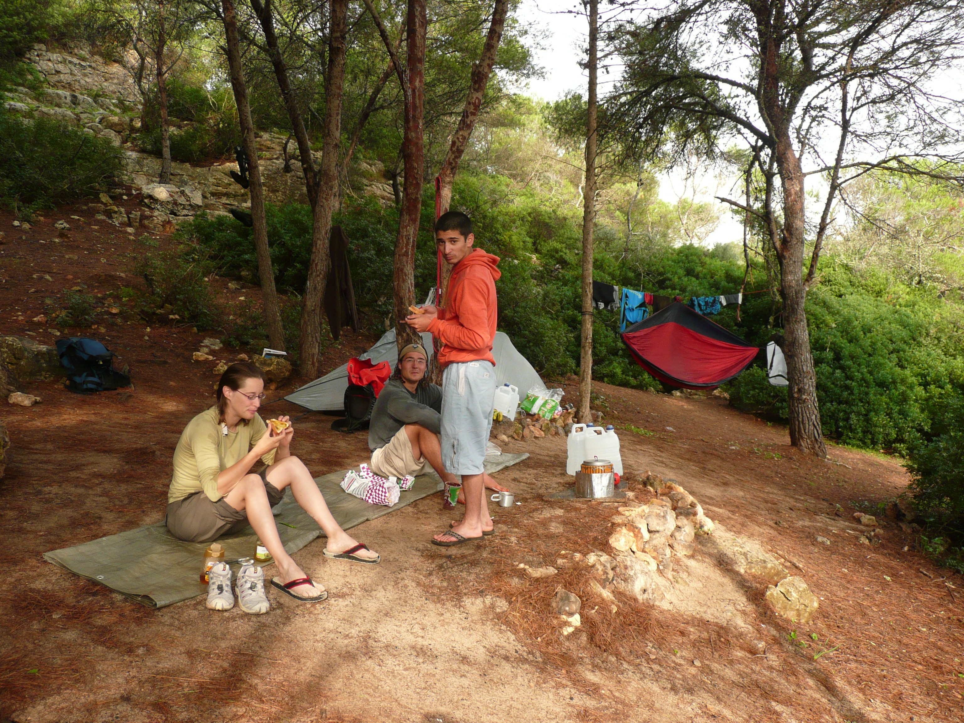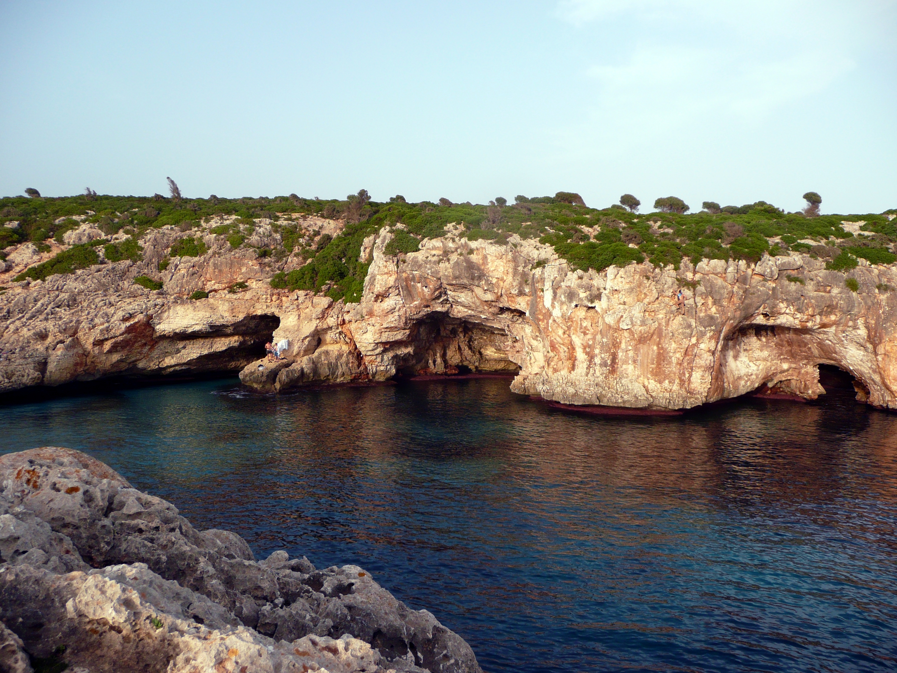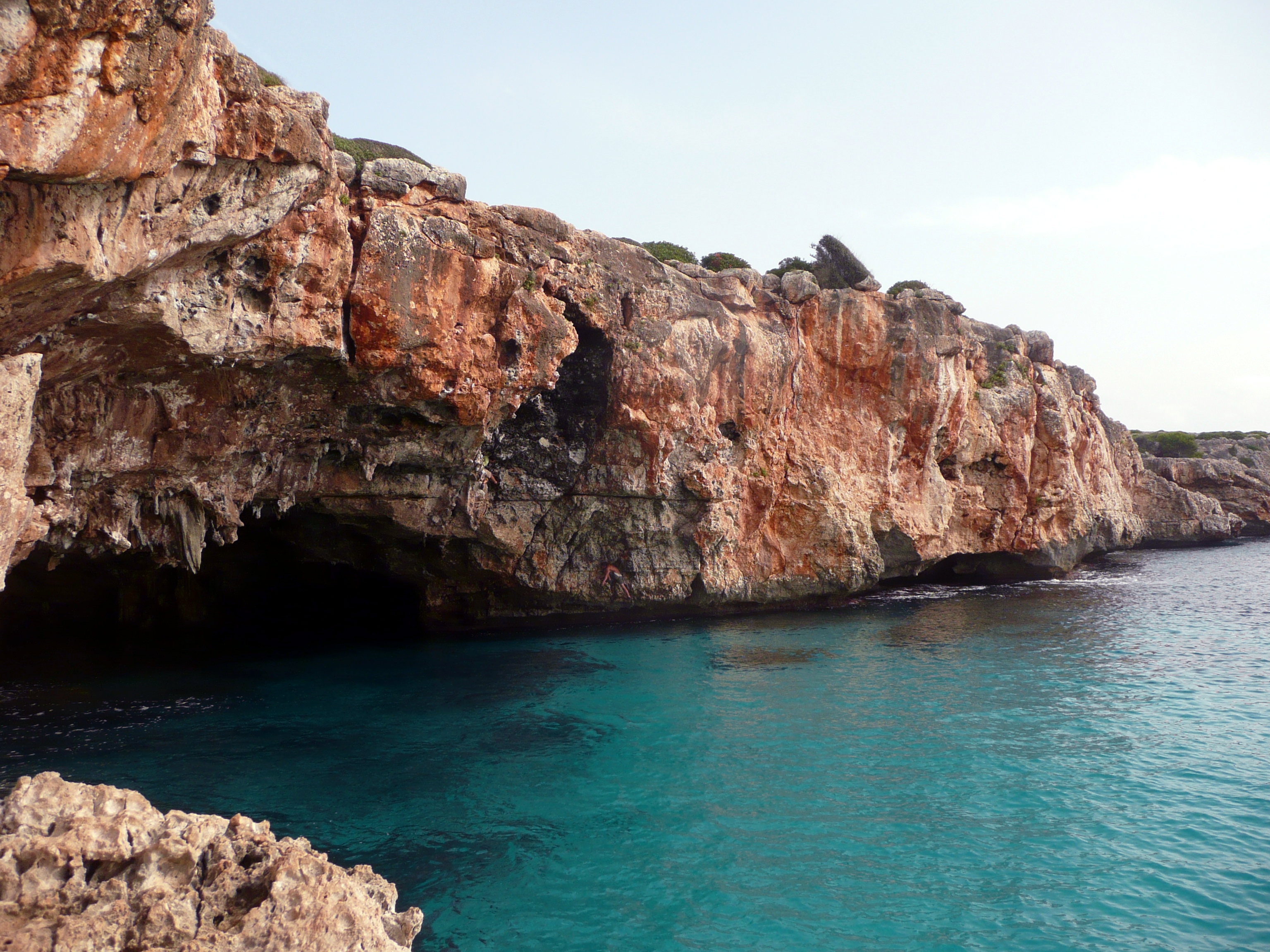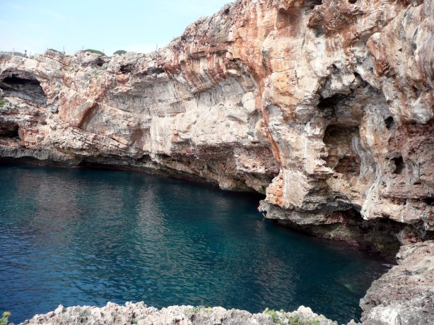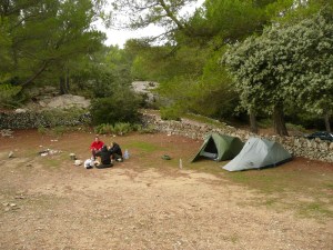 Si on continu à marcher au sommet de la falaise en allant en direction opposée à Porto Cristo on peut trouver une ruine (4 murets pas très haut, en tendant une bache de 10*10m çà fait une petite maison pour les jours de pluie ou de vent) et juste à coté un emplacement pour deux tentes pour y camper, sans ombre par contre. De là on accède au village à pied en 15min avec des Supermarchés et la douche sur la plage. La base !