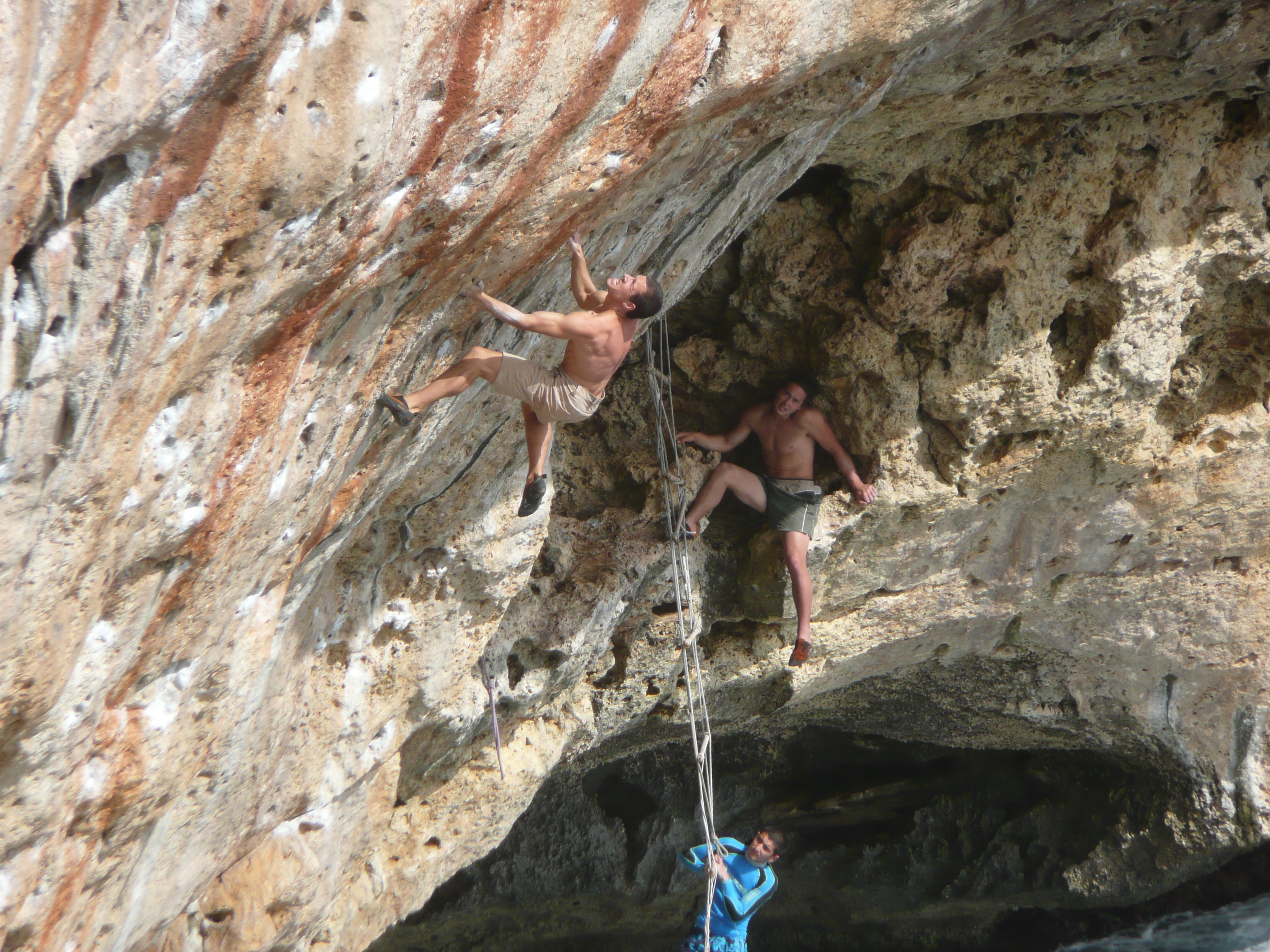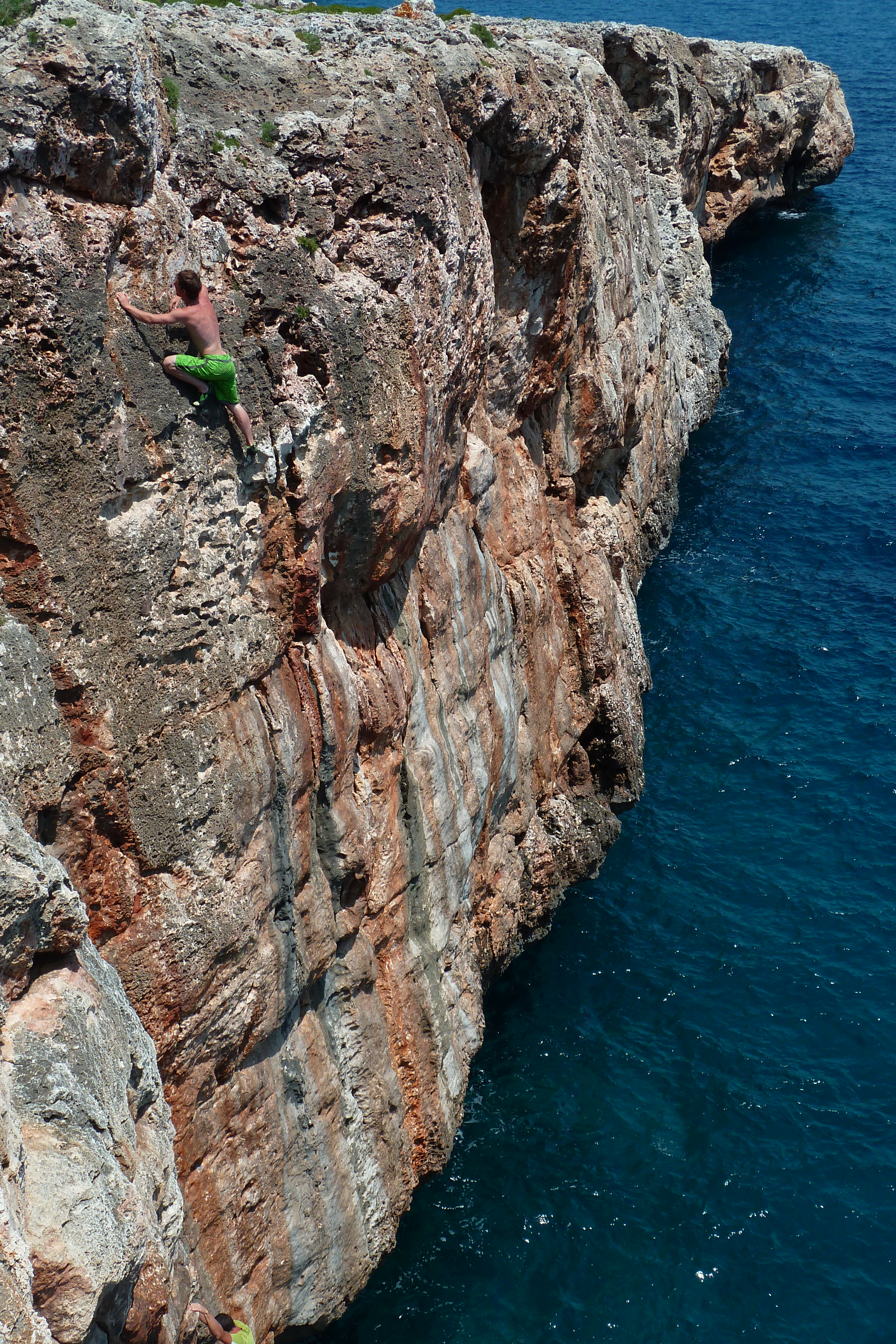 Octobre, car en été il fait trop chaud, au printemps l’eau est froide et le soleil n’est pas assez rasant pour sécher le rocher en dévers ; plus tard la mer est plus souvent agitée. En octobre la mer est encore bien chaude, il fait moins chaud pour grimper, la mer n’est pas souvent agitée et le rocher déversant sèche bien au soleil. En plus à cette période il y a moins de monde sur l’île et sur les falaises. Néanmoins, si vous ne faîtes pas de psicobloc, l’hiver doit être top !