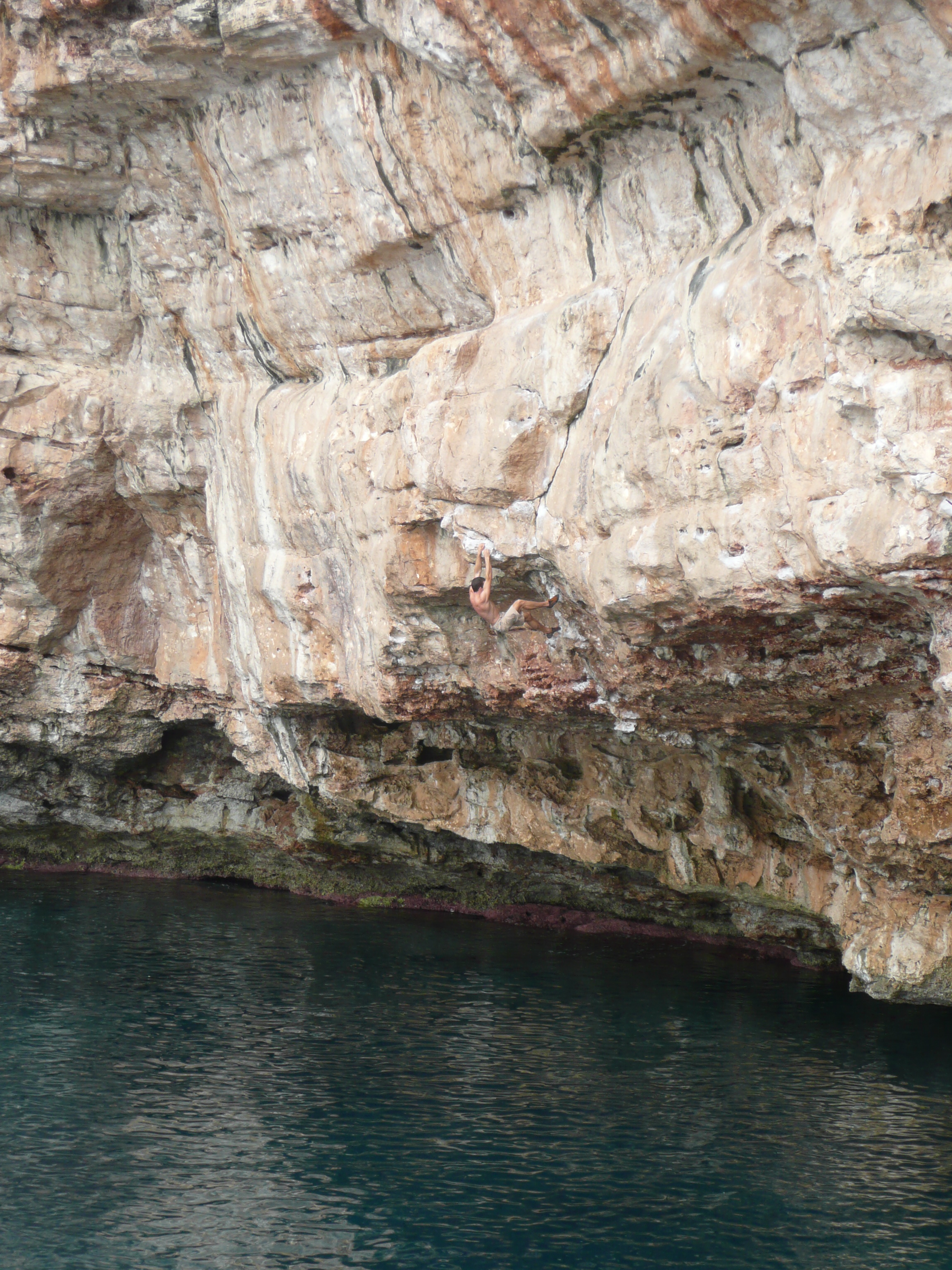 A réserver par temps calme et sec car c’est un peu gras sur les départs. La plupart des voies sont dans le 7 assez physique (gros dévers), mais pour ceux qui ne grimpent pas c’est un bel endroit pour nager et il y a une plate forme en face de la falaise pour admirer les grimpeurs.