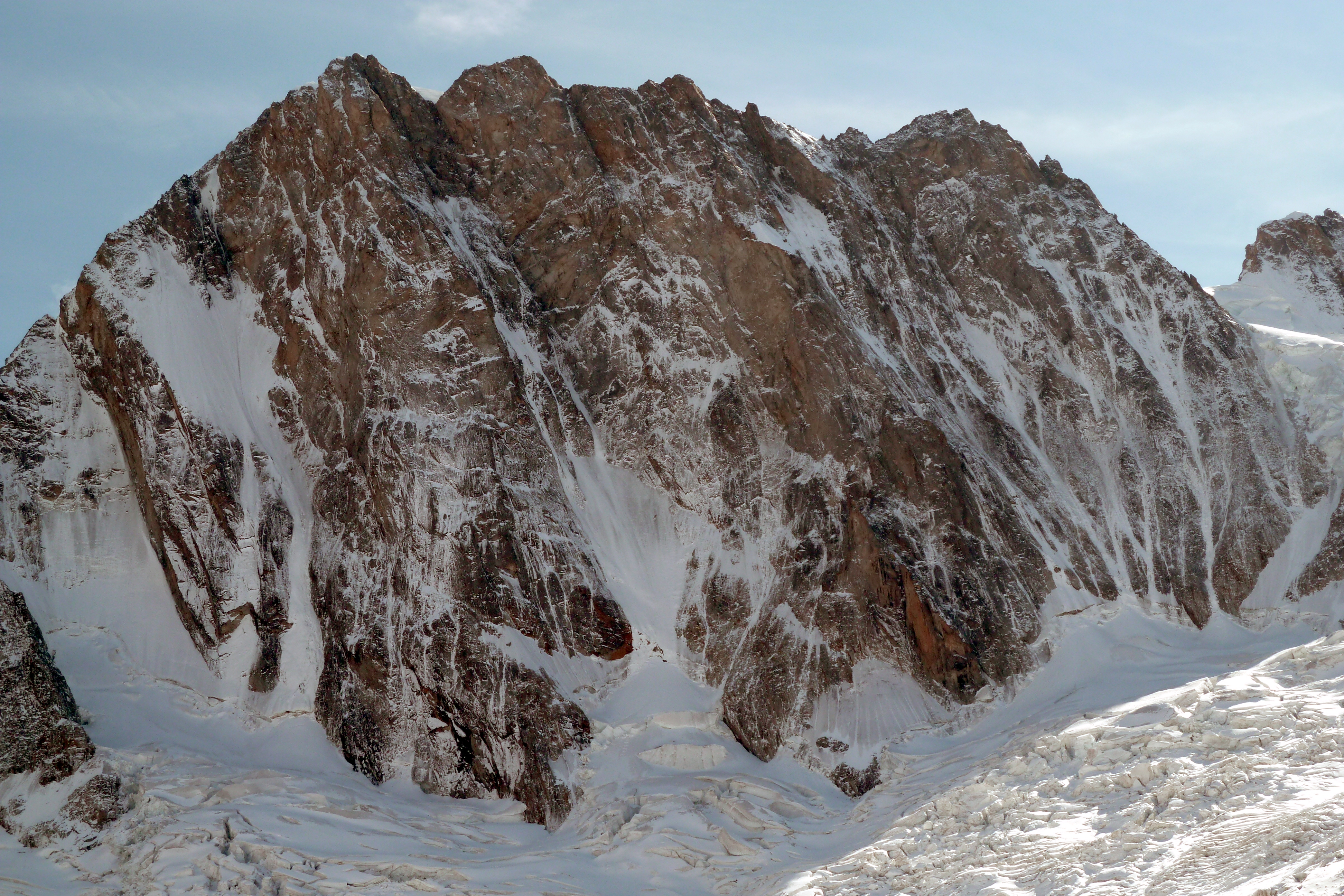 Ensuite, changement de décors, direction les grandes Jorasses. Avec Kora on avait 4 jours devant nous, météo belle et stable, températures fraîches et surtout une météo précédente ayant favorisé la formation de glace et de neige dure dans les fissures et sur les rampes. Une ligne attire notre attention, la directe de la pointe Walker (appelée Monomania) ouverte l’année dernière par Désécures et Sourzac. Cette ligne a l’avantage d’être formée rapidement car le début emprunte le Linceul puis termine dans du rocher mixte. Leur vidéo résume très bien la voie : http://www.tvmountain.com/video/alpinisme/8060-grandes-jorasses-walker.html