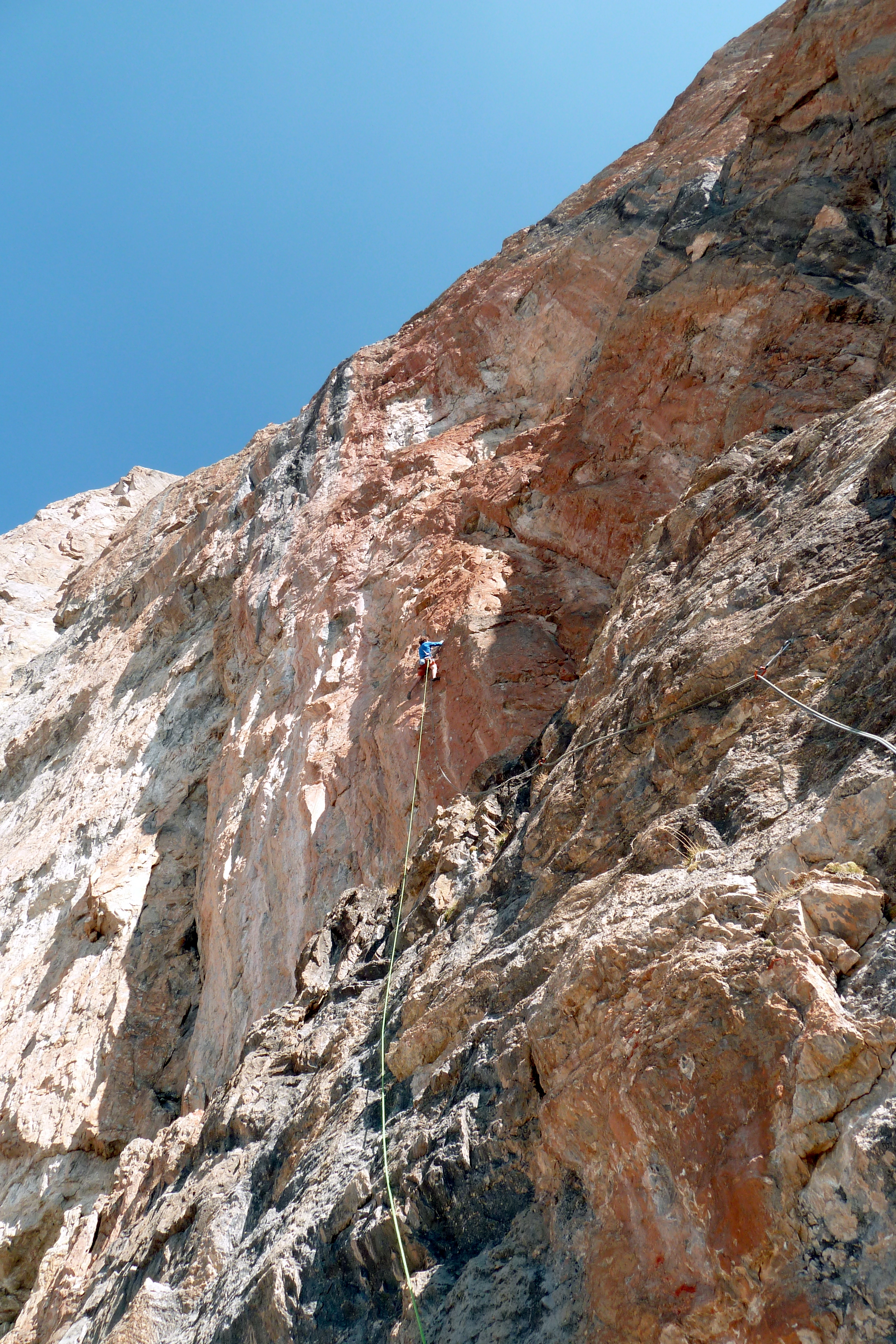 La première longueur est complètement typique d’une première longueur là-bas : un grand bombé bien physique et bloc. Mais dans notre cas, même si le départ est en effet bien physique, la suite n’est pas très bloc, un bombé final en 7b et une dalle qui ne fait pas rire composent cette première longueur, la classe ! La suite continu dans le 6 bien soutenu dans du beau rocher adhérent avec de belles prises et des passages en fissures larges bien sympathique. Le passage en A0 du toit rajoute un peu de gaz, trop sympa !