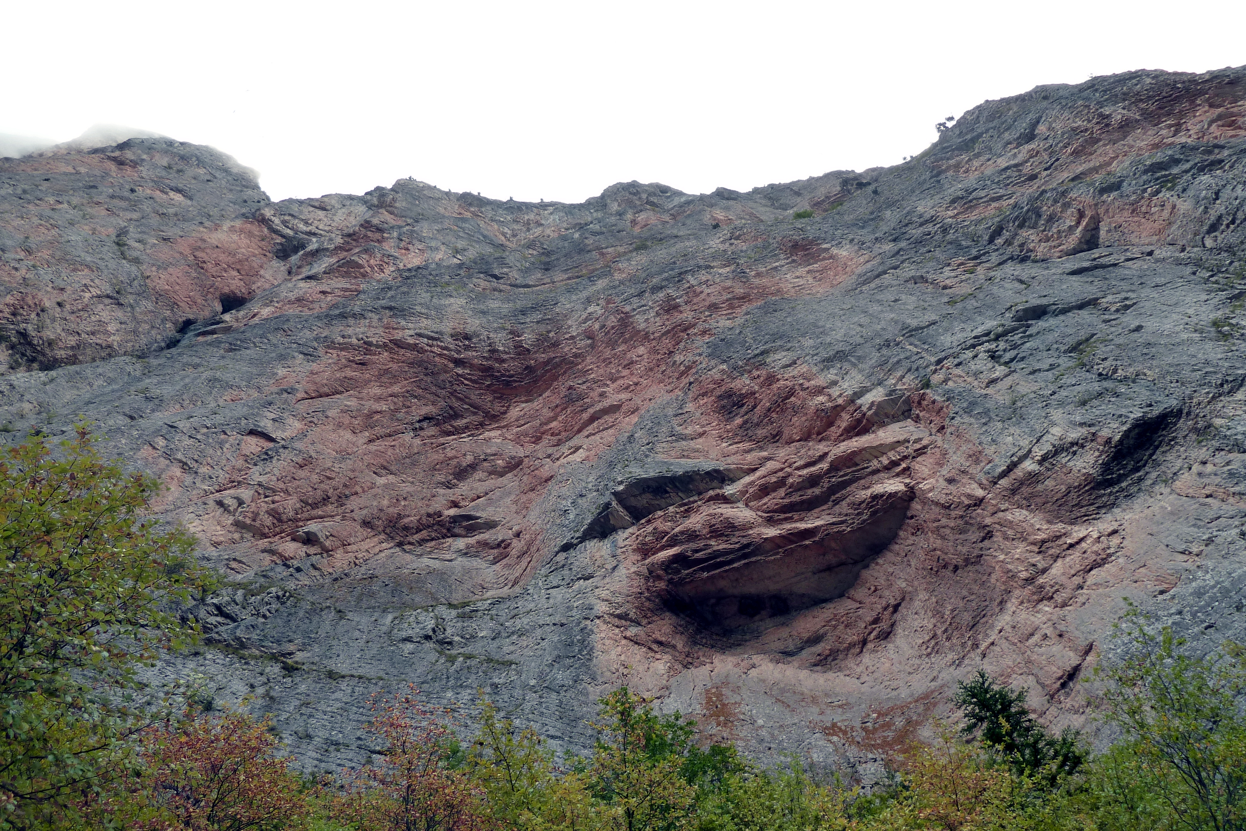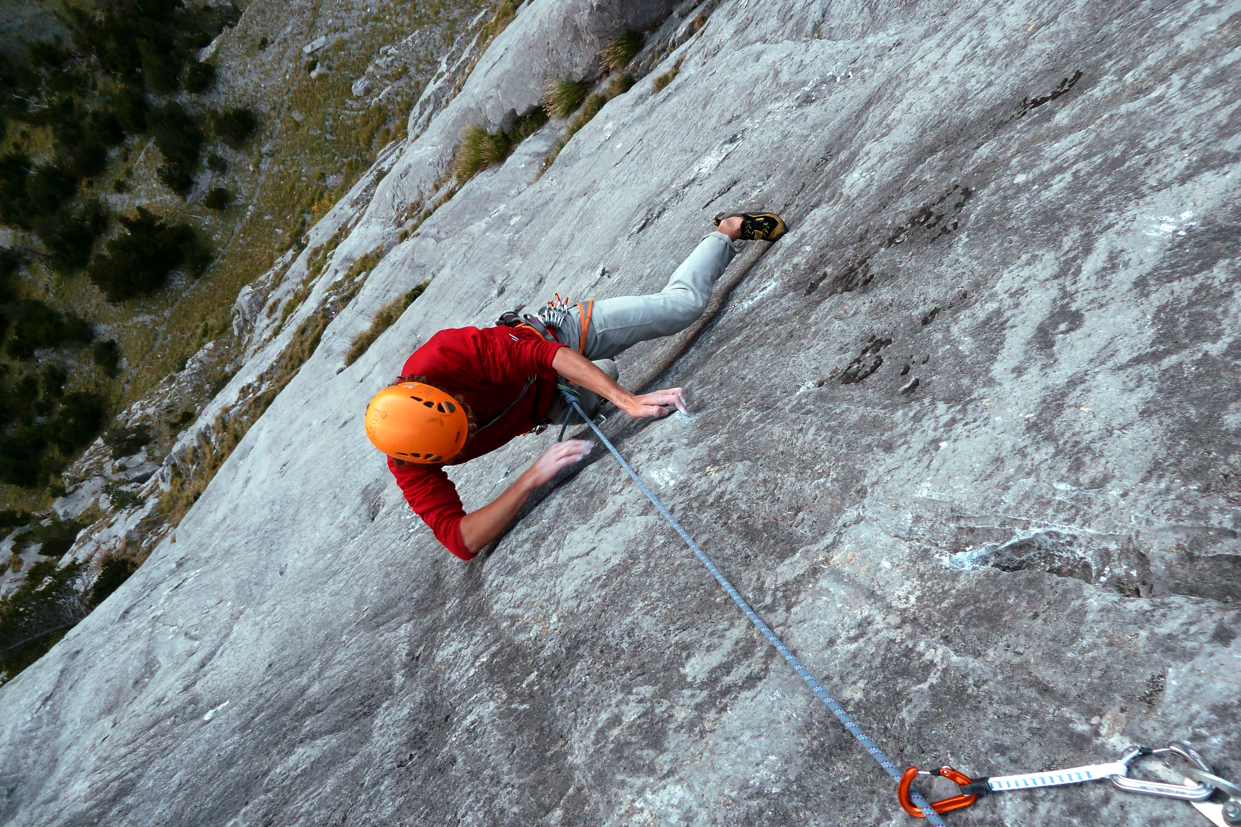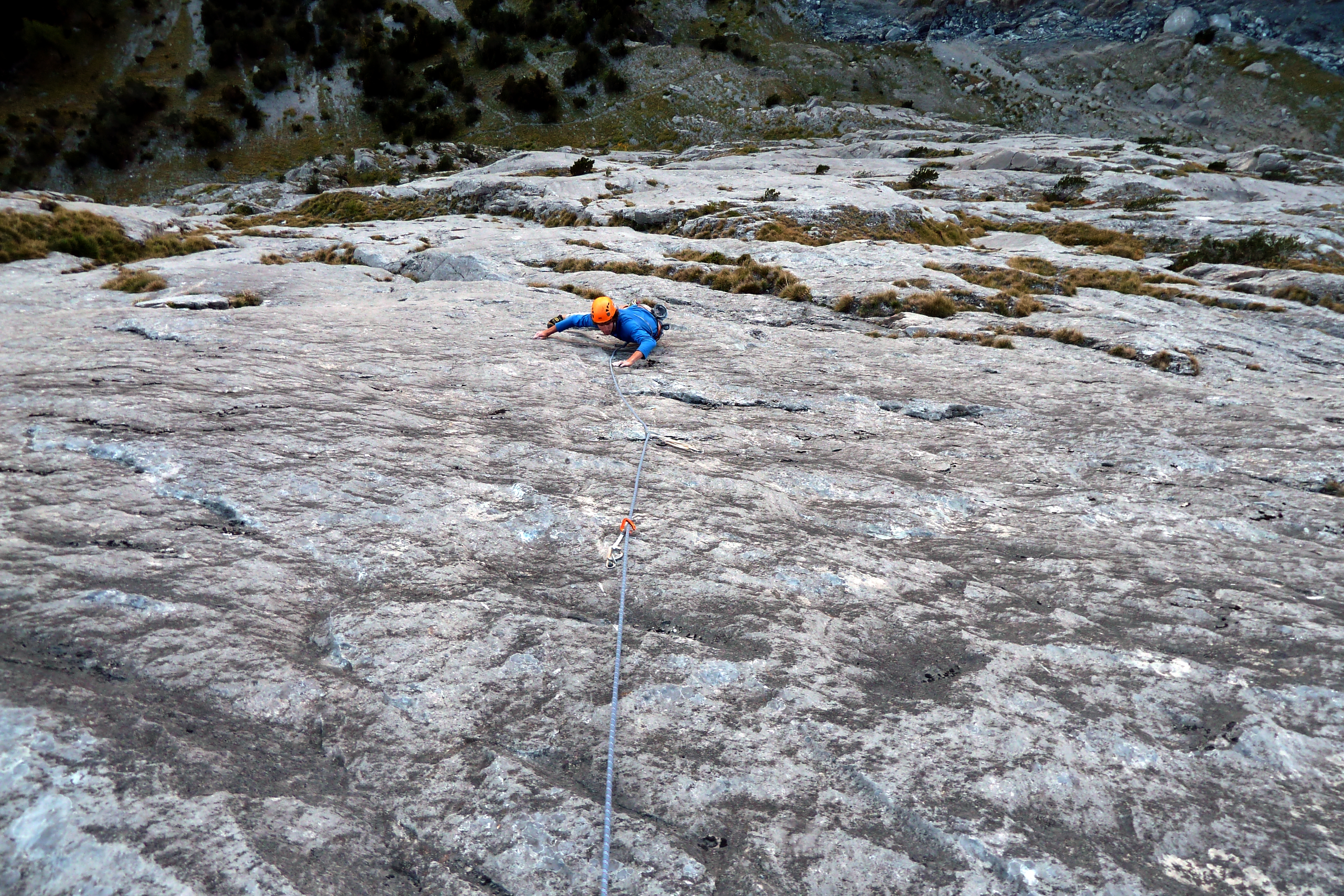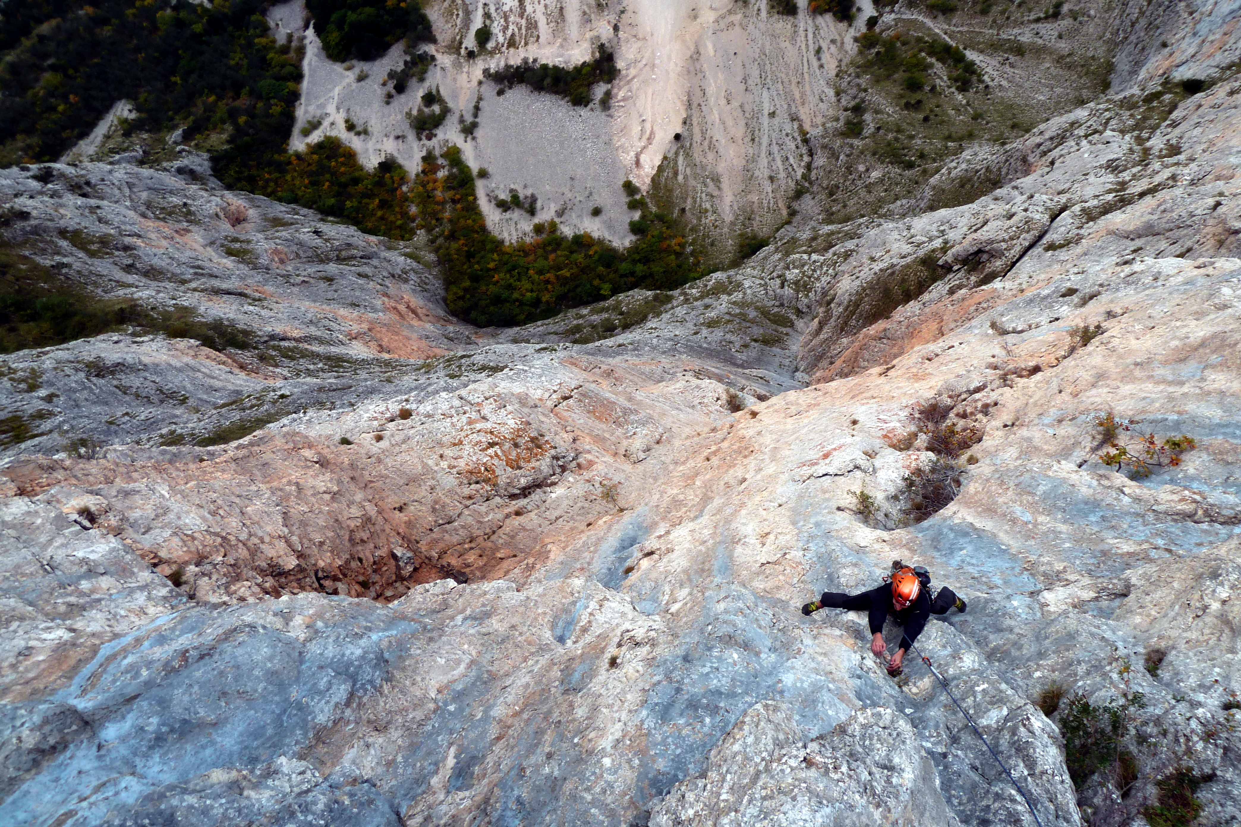 Ce n’est pas de l’escalade déroulante mais le rocher vaut le déplacement : petites réglettes et plats plutôt adhérents. On découvre les prises au fur et à mesure que l’on grimpe, d’en bas on ne voit qu’un mur lisse ! Ce qui est marrant c’est que lorsque l’on grimpe on a vraiment l’impression d’être en plein milieu de grand murs gris, en regardant les photos prises d’en haut on a plus l’impression de grimper entre des vires herbeuses… Ce qui est sûr c’est que l’escalade y est démente, çà grimpe tout le long, pas de relâchement, il faut rester concentré.