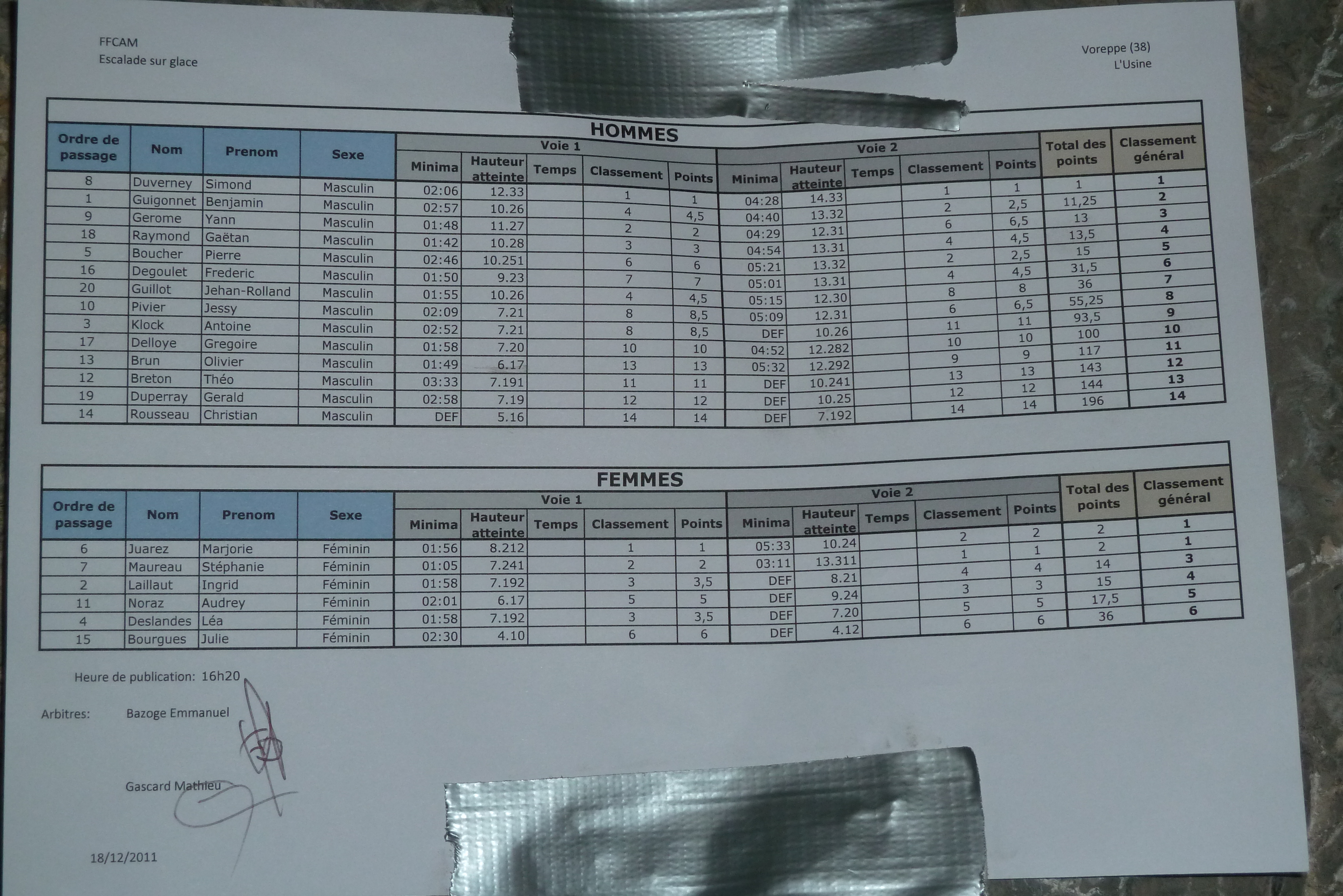 Résultats de la journée de sélection de l’équipe nationale FFCAM d’escalade sur glace pour les coupes du monde 2012, les noms en gras sont les sélectionnés pour l’équipe :