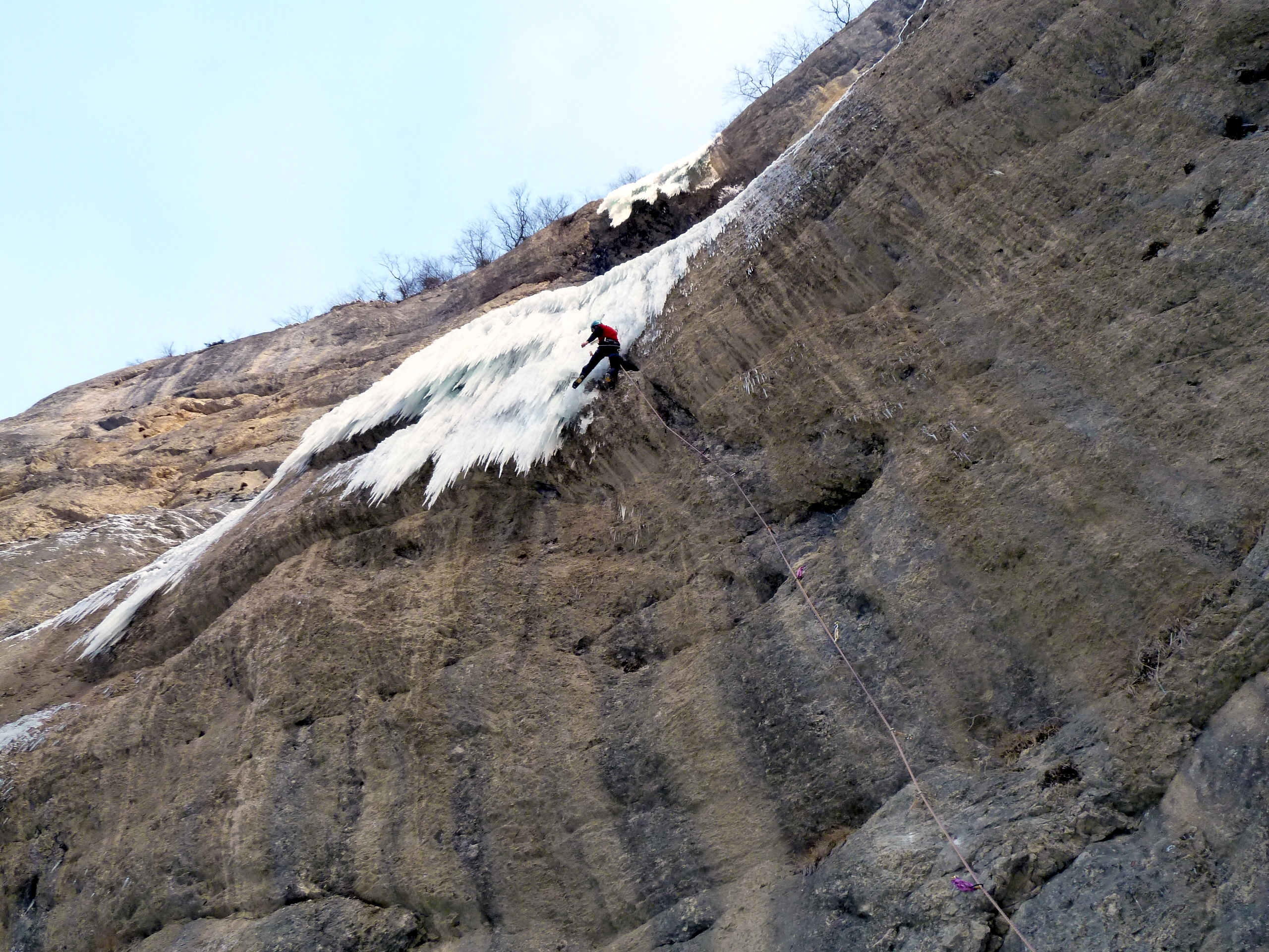 Cascade : L1, M7, 35m, départ en rocher déversant (16 dégaines) pour venir récupérer une draperie, relais sur la vire