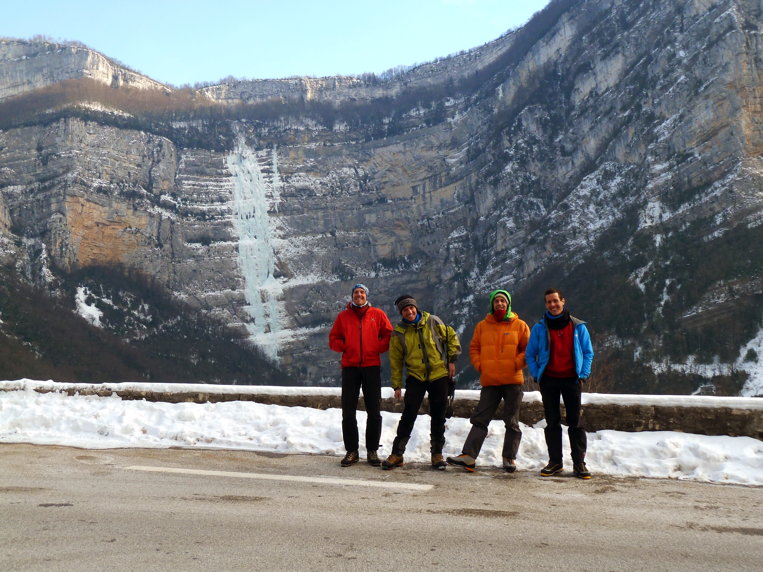 Des années que j’attendais çà, chaque année la même question : vas-t’il faire assez froid pour geler autant d’eau sur 380m et une eau sortant d’un réseau à 8°C ? En plus, les commentaires du topo font peur « risque d’effondrement », « demande une grande expérience et un excellent moral »… Mais on peut compter sur nos amis guides du Vercors pour tester et nous tenir au courant de conditions dans leur pays. Les conditions étaient là, il ne fallait pas les rater ! Donc le lundi 13 février 2012 nous filons avec Dèg, Ben Ribeyre et Ben Guigonnet, une bonne équipe !