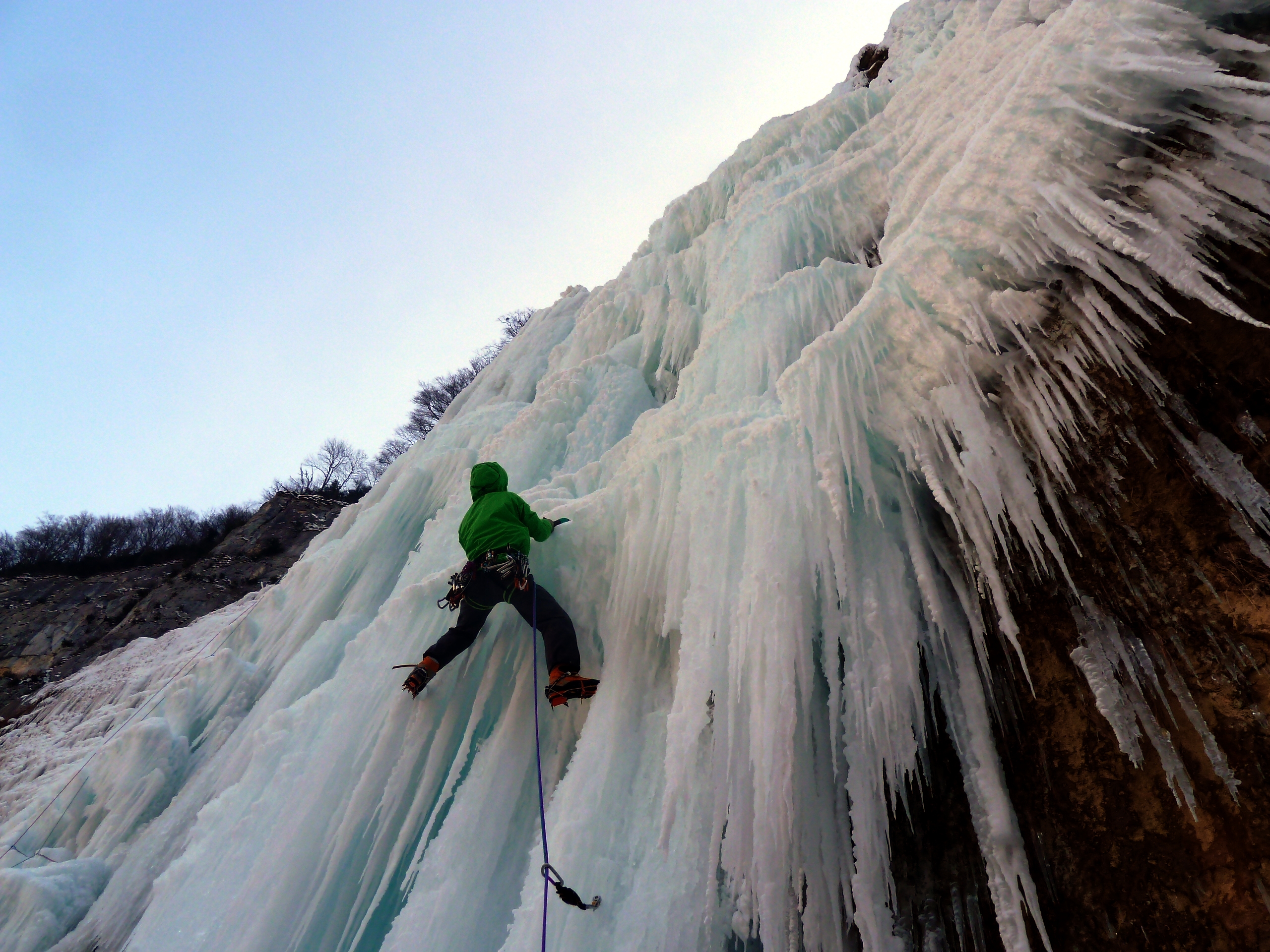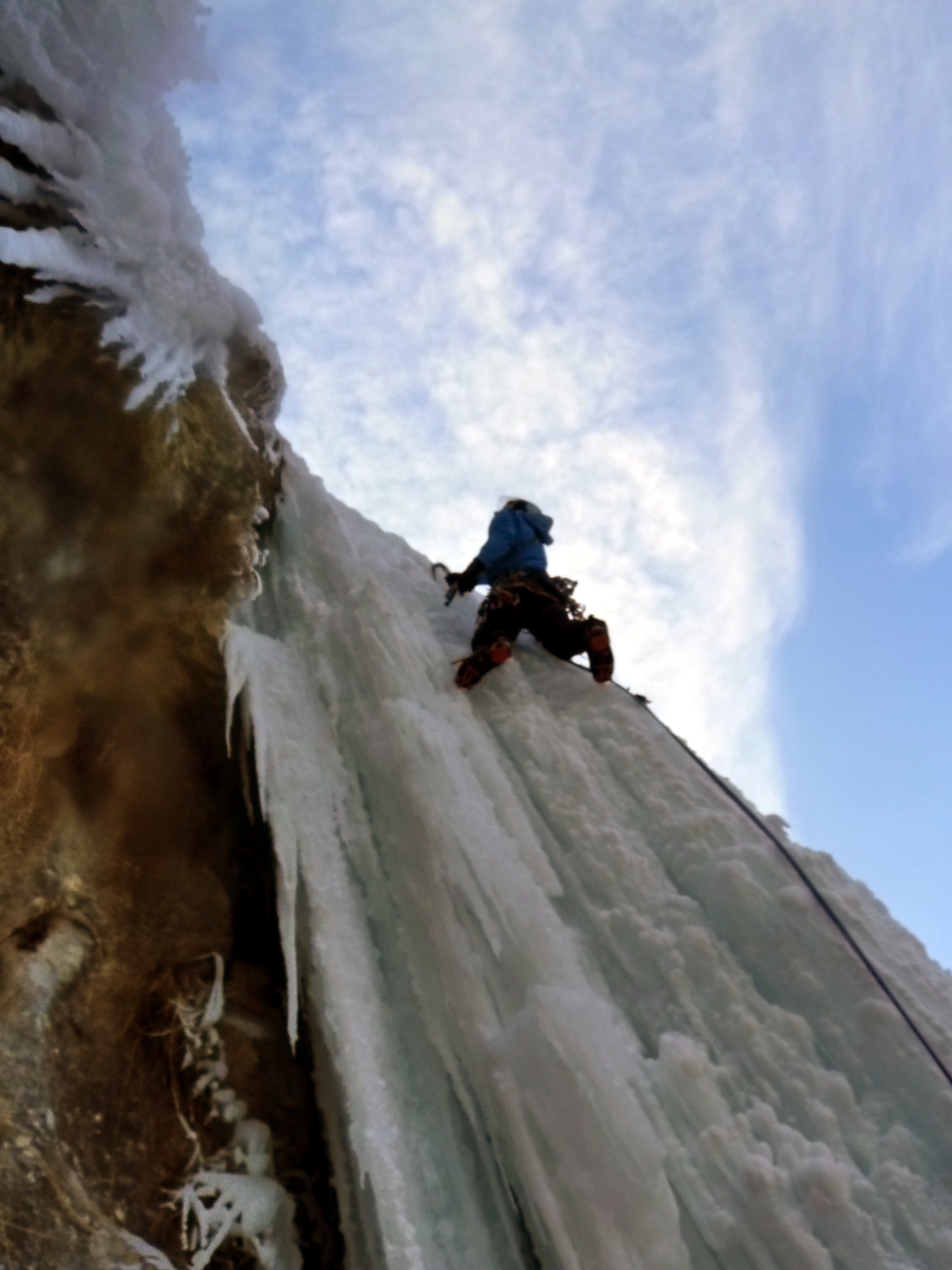 Nous rejoignons rapidement une autre cordée parti à la frontale et avec le matos d’époque. A trois cordées de front dans cette cascade çà passe, çà vous laisse imaginer la largeur de celle-ci…