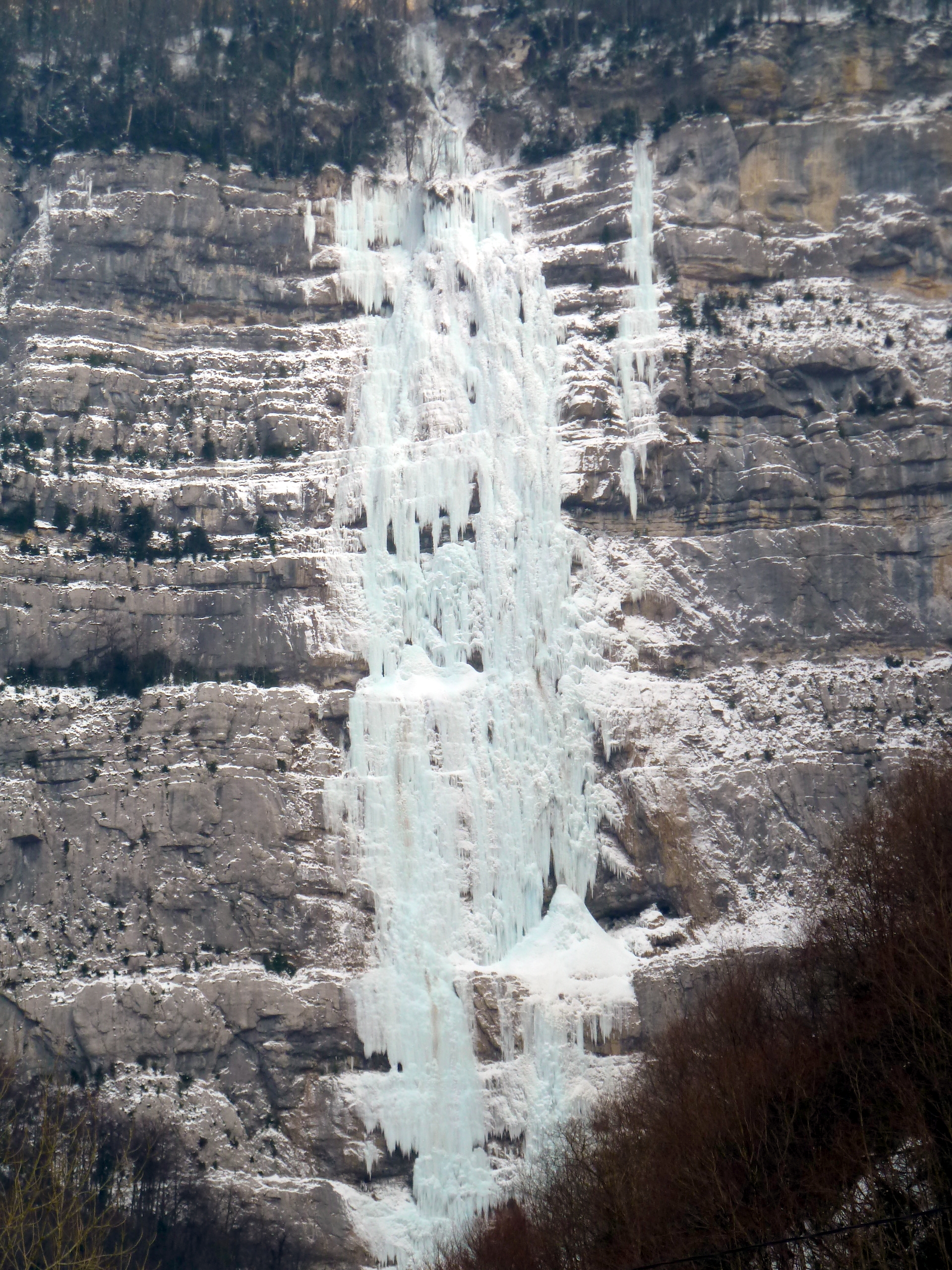 Infos : pour l’accès, passer derrière la centrale à gauche puis suivre une piste à droite qui mène directement au pied de la cascade. Un sentier en face, rive gauche, permet aussi d’y accéder mais est plus long. Passer le plus à gauche de la cascade pour éviter les effondrements en cas de dégel… Nous n’avons pas fait la longueur en grade 6 tout à droite car la sortie du tube ne nous semblait pas vraiment épaisse… La cascade ne prend pas actuellement le soleil mais mieux vaut partir tôt pour éviter le réchauffement ! Nous sommes passés au plus raide à chaque fois (grade 6), mais en louvoyant on peut aisément passer en grade 4+ maxi.