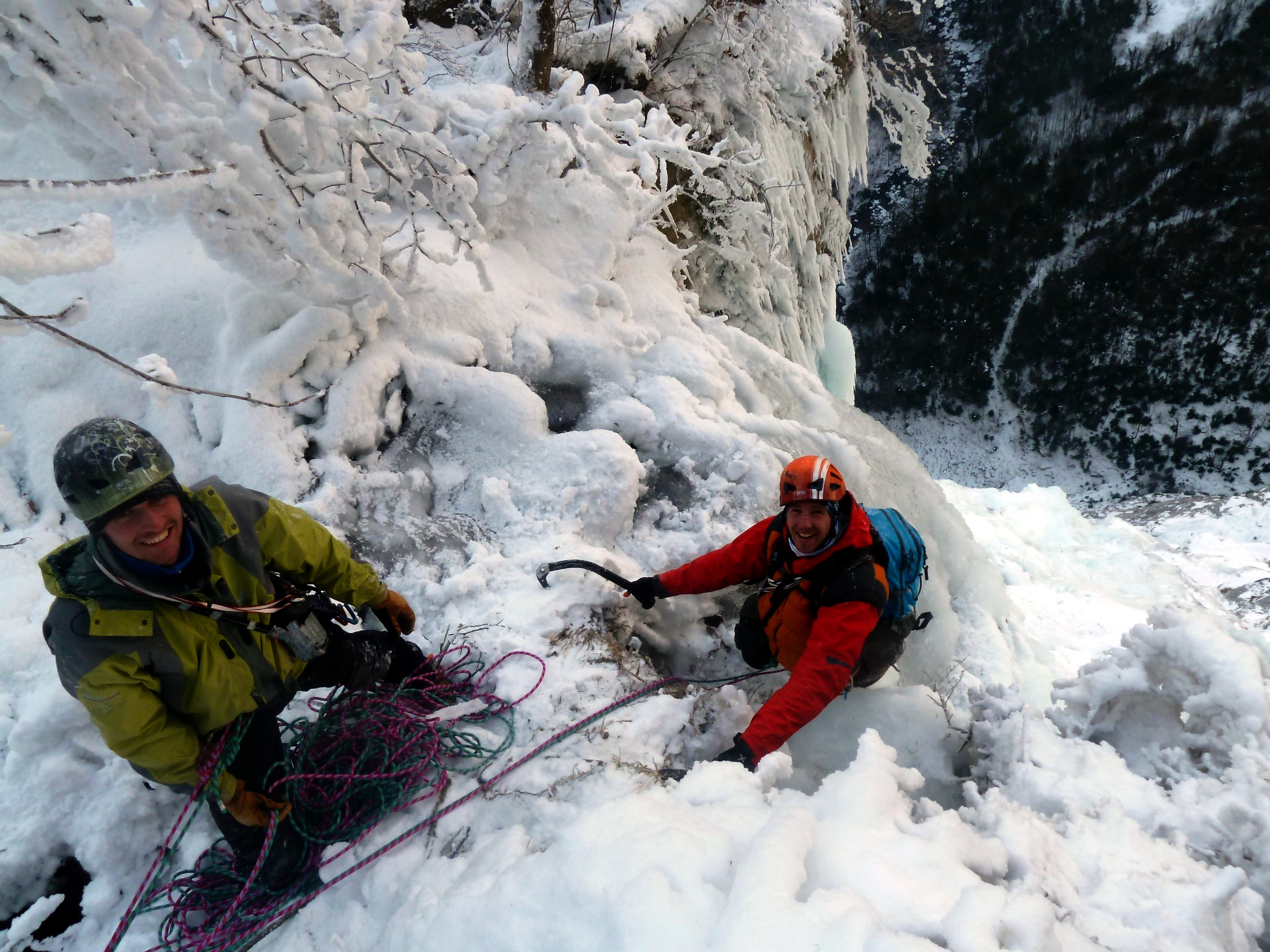 Après trois très grandes longueurs en grade 5 maxi, on arrive à un grand mur (60m encore) avec plusieurs passages raides, notamment de grosses méduses à passer puis un tube bien raide, c’est la longueur clé de cette cascade ! Trop top !! Ben G. et Dèg envoient du gros.