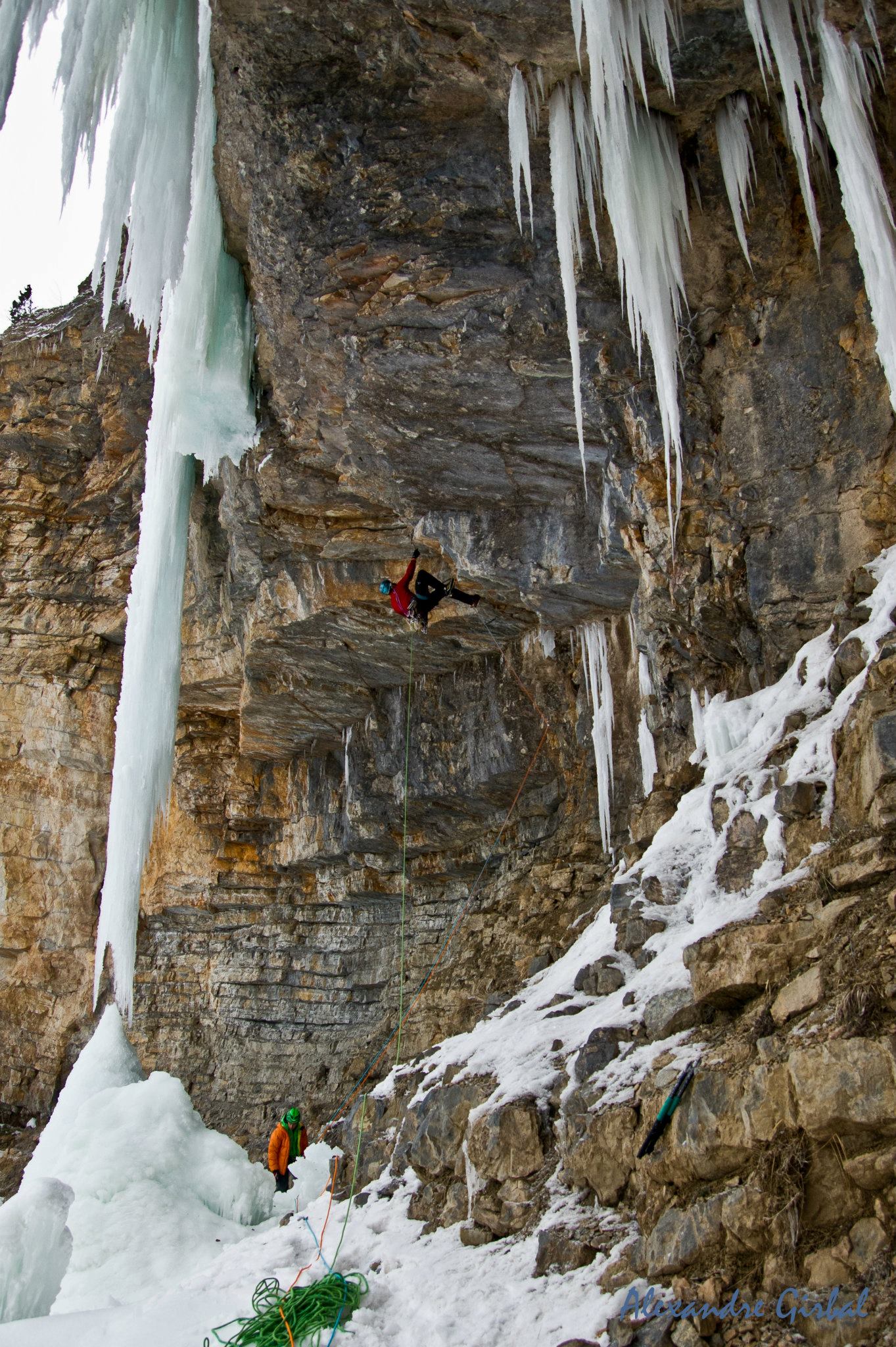 Une première longueur dans un bon dévers sur des bacs jetables nous laisse penser que celle-ci n’a pas été répété souvent, pas facile donc de faire à vue. Heureusement que nous avons de la pratique dans ce genre d’inclinaison, merci l’Usine ! Je rajoute un piton au début car la résurgence n’a pas gelé pour nous amener au premier spit à 5m de haut dans le toit. Ensuite, quelques mouvements physiques dans le toit sur 6 m permettent de rejoindre la glace qui était pour le coup bien haute ! Les derniers mouvements nécessitent une bonne croyance dans la tenue des cailloux par le gel… La suite est encore raide dans la glace sur 6m puis une pente vous amène au pied du pilier de la deuxième longueur. L1, M8, WI 5+, 50m.