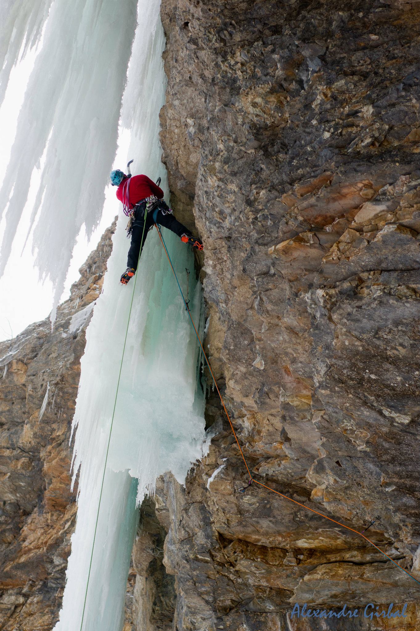 La deuxième longueur consiste donc à remonter ce beau pilier raide puis des passages de grosses méduses déversantes, la glace est parfaite ce jour-là mais il faut faire du nettoyage, ce qui amuse Benjamin en nous envoyant des frigos par-dessus la tête ! L2, WI 6, 30m.