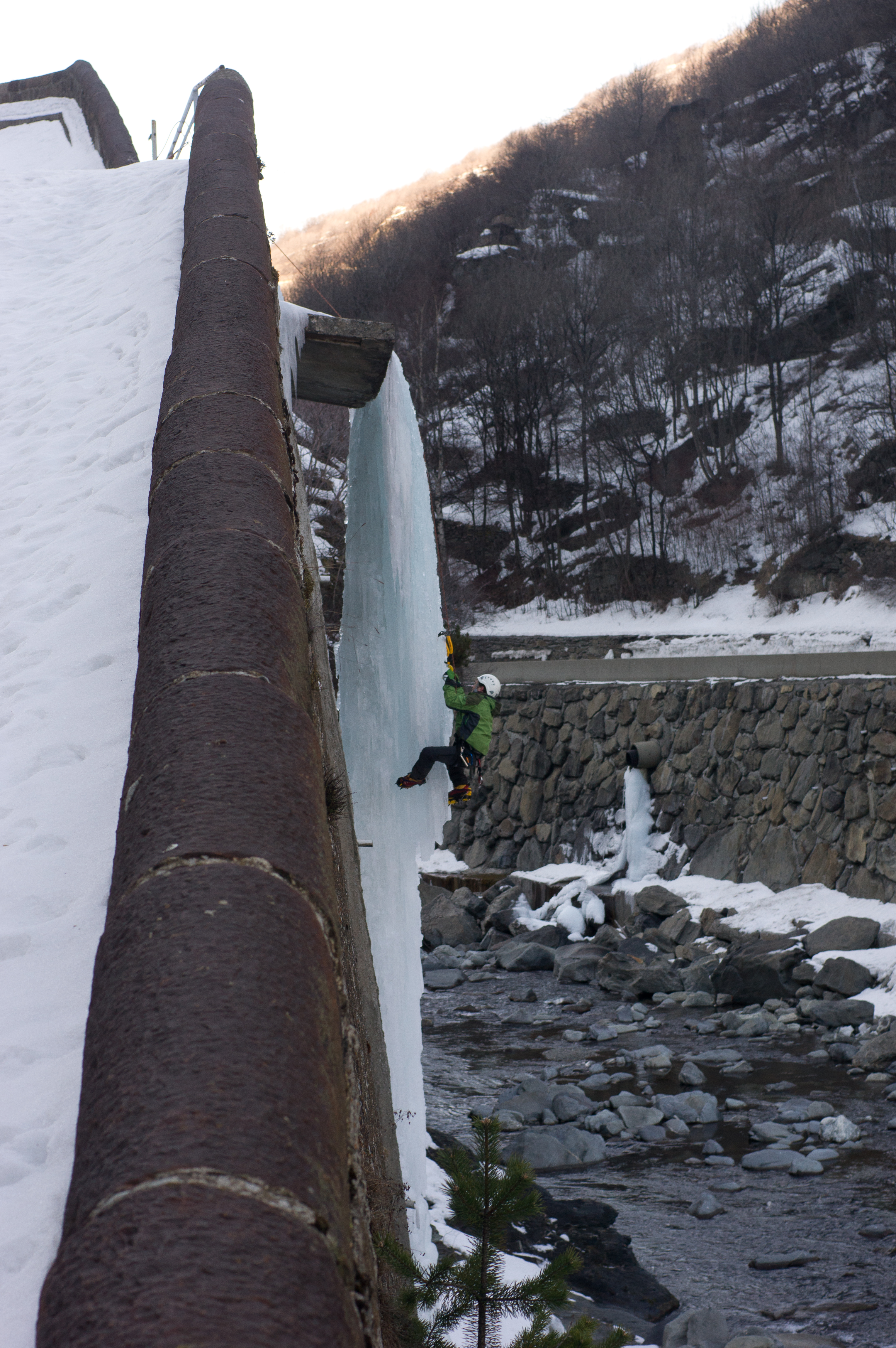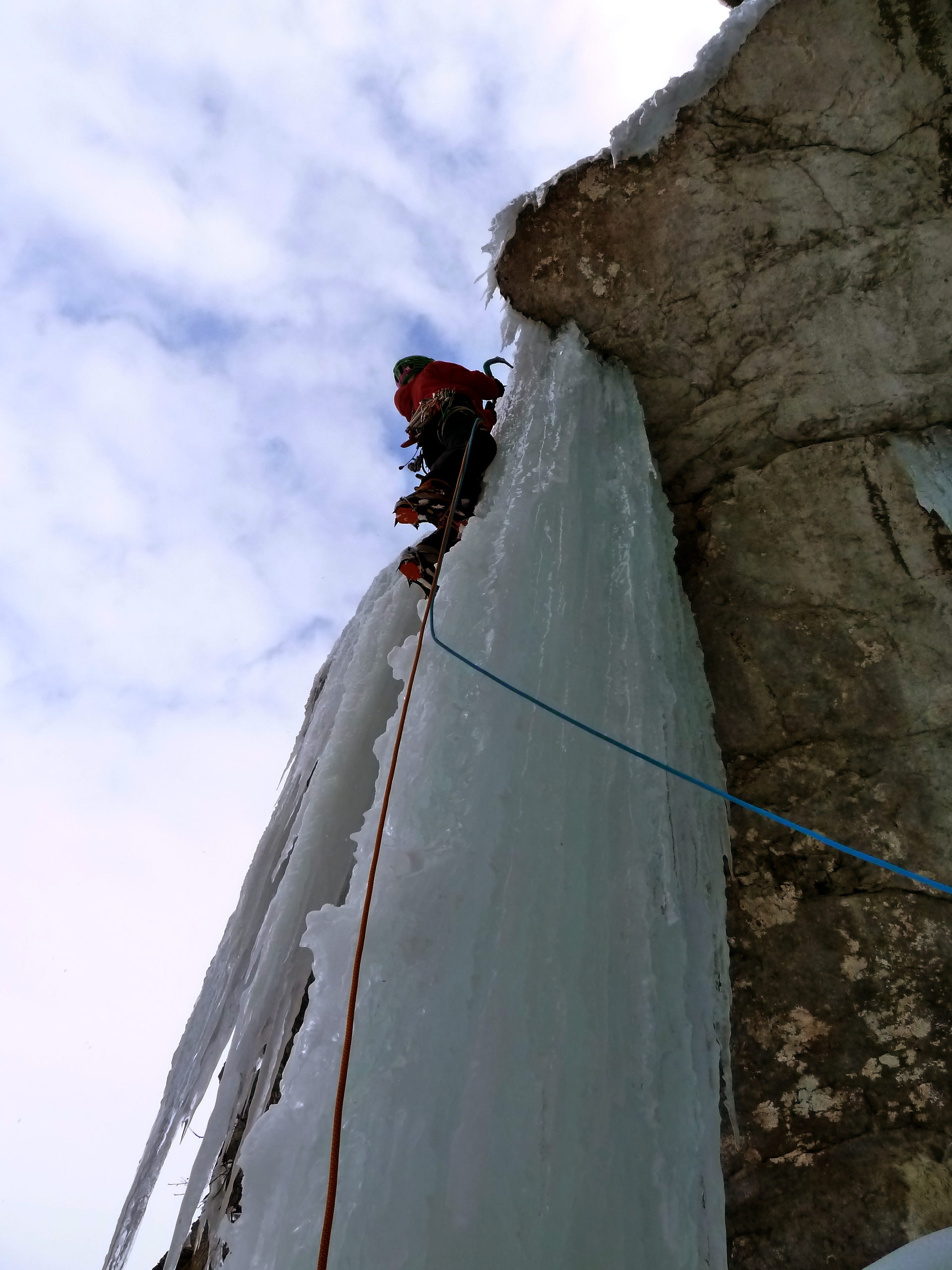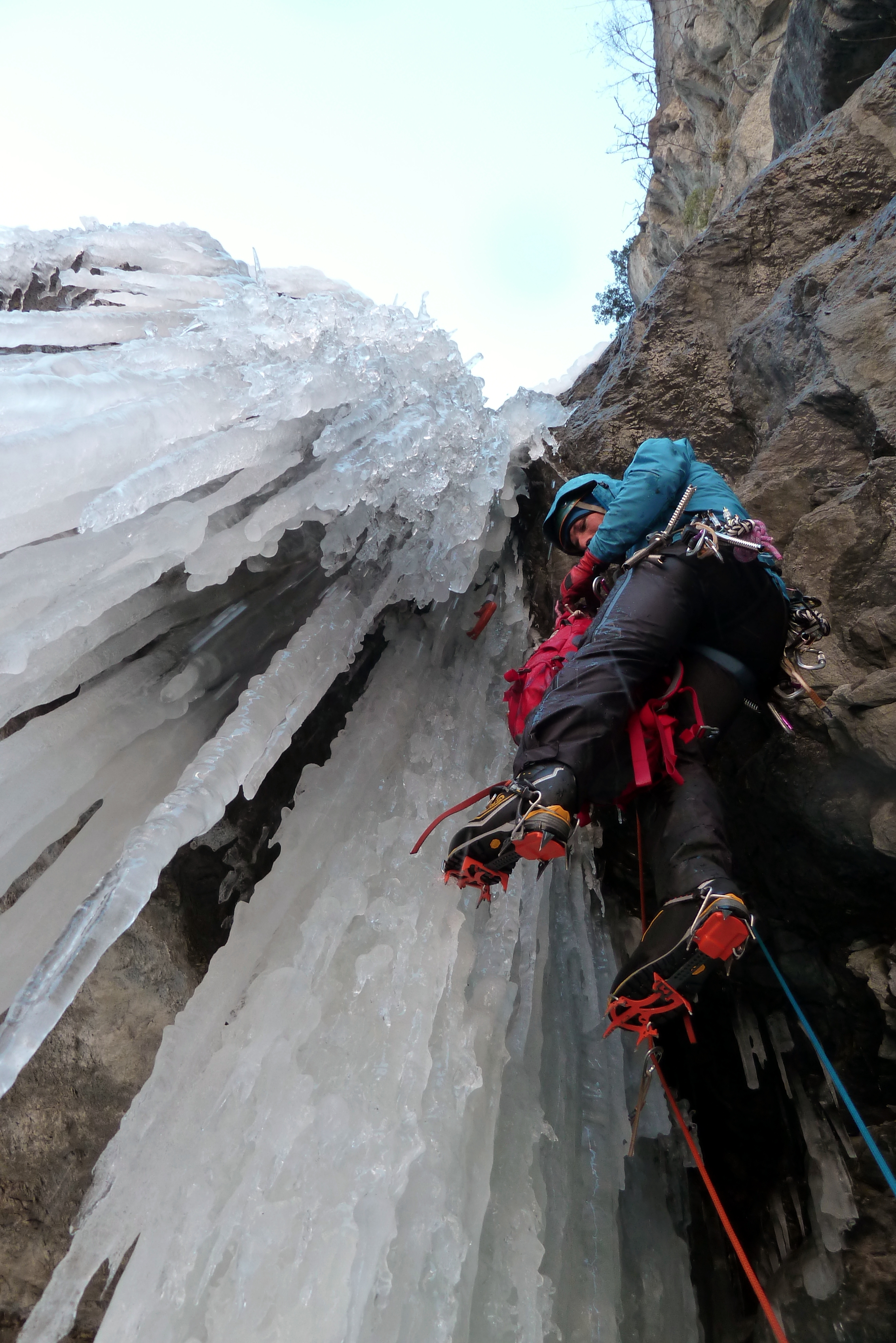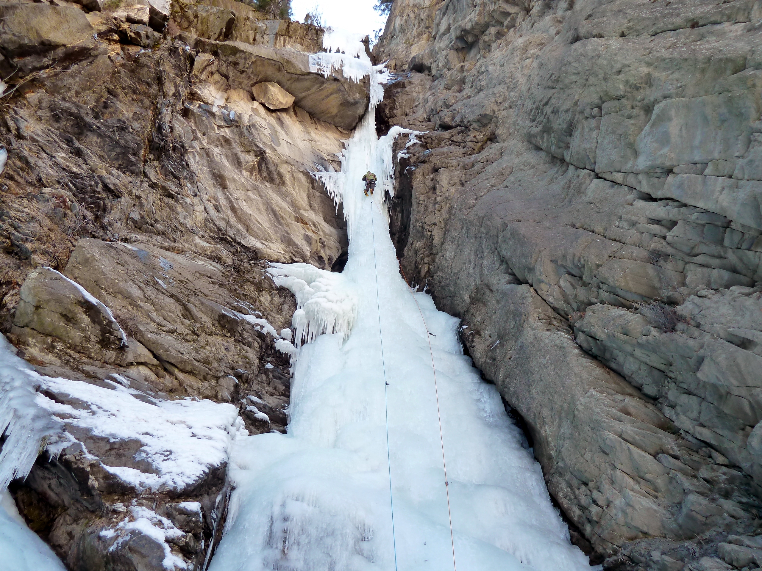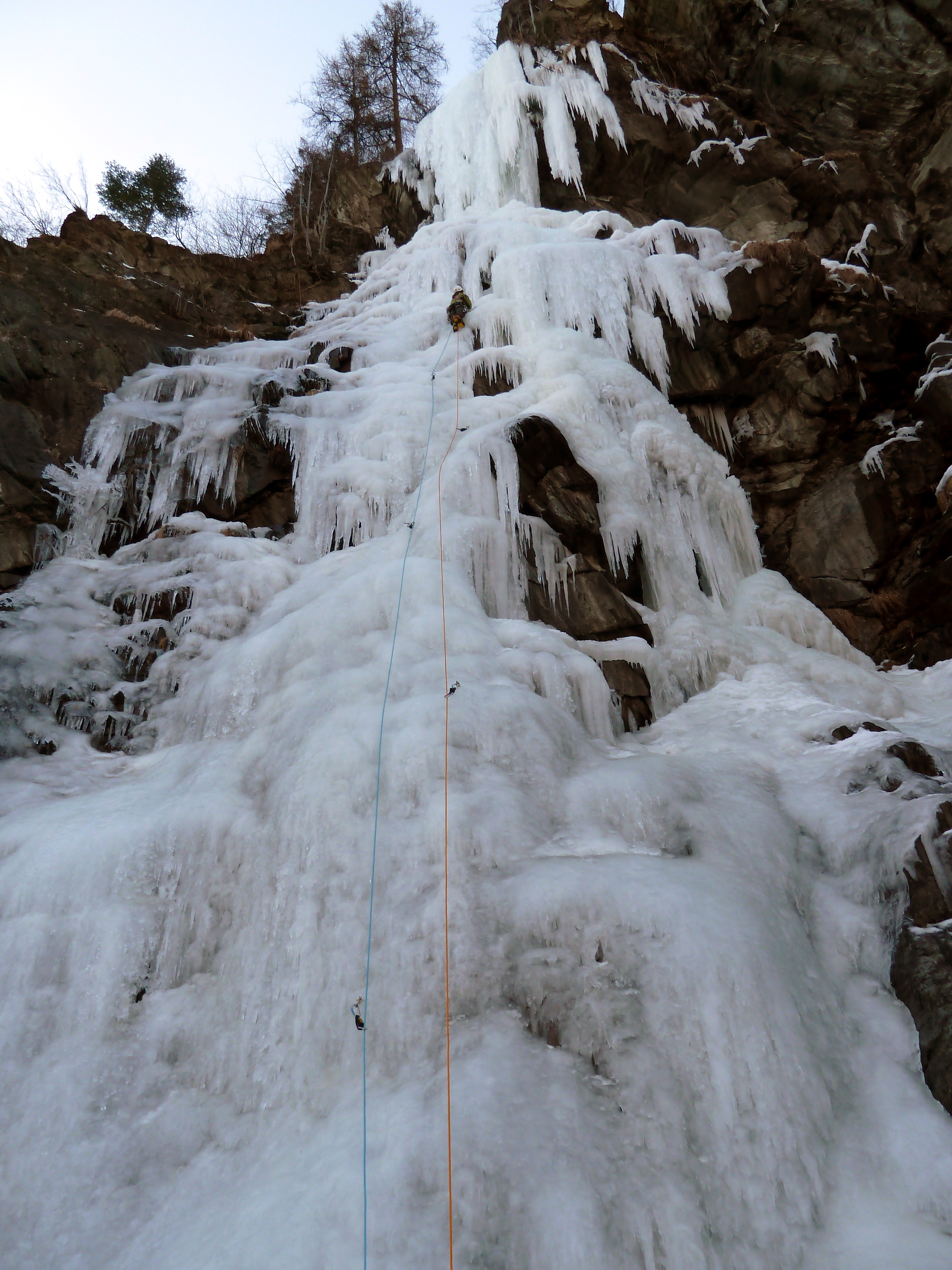 Avec Alexandre Girbal, notre photographe de « La Muse« , on est allé en Maurienne au secteur d’Orelle. Cette cascade a le double avantage de ne pas être trop loin de Chambéry comparativement aux cascades de Bessans et d’avoir 5min de marche d’approche. Composé de deux ressauts de 50m séparé par un ruisseau sur 200m, cette cascade vaut le détour. La deuxième partie du premier ressaut est bien raide dans un mur assez large mais dans de la glace moyenne (vaisselle et eau qui coule dessus) pas facile à protéger et qui n’offre que peu d’ancrages fiables.