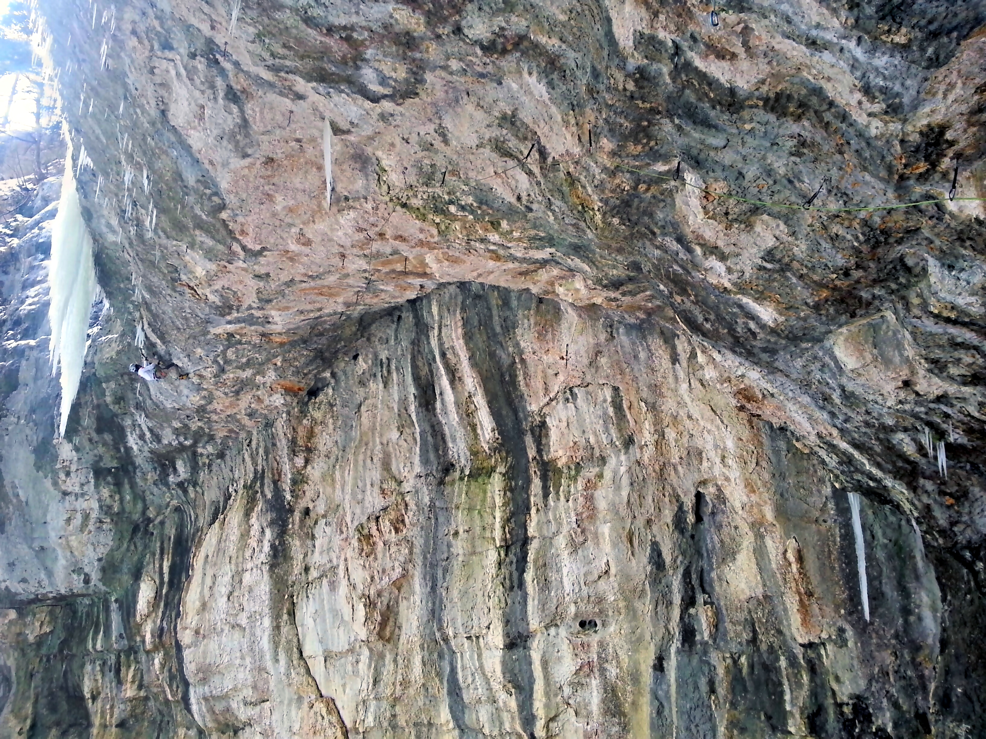 On enchaîne ensuite avec le toit que l’on atteint avec deux mouvements de descente dont le deuxième assez loin. Ensuite on enchaîne 6 mouvements pas extrêmes mais dans un vrai plafond, on arrive alors à un mouvement bien difficile où il faut aller chercher une inversée en descendant (vraiment ultime dans l’enchainement).