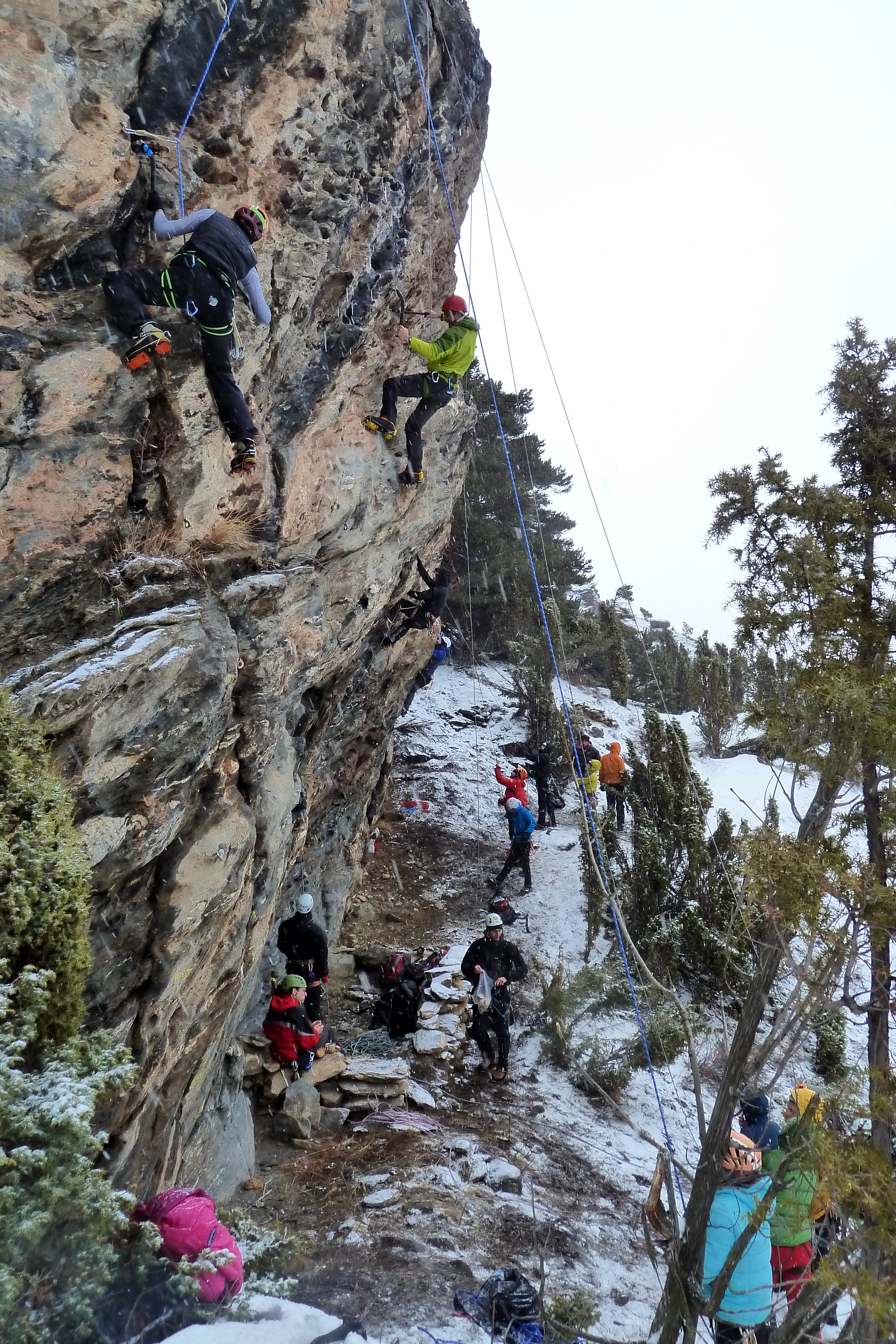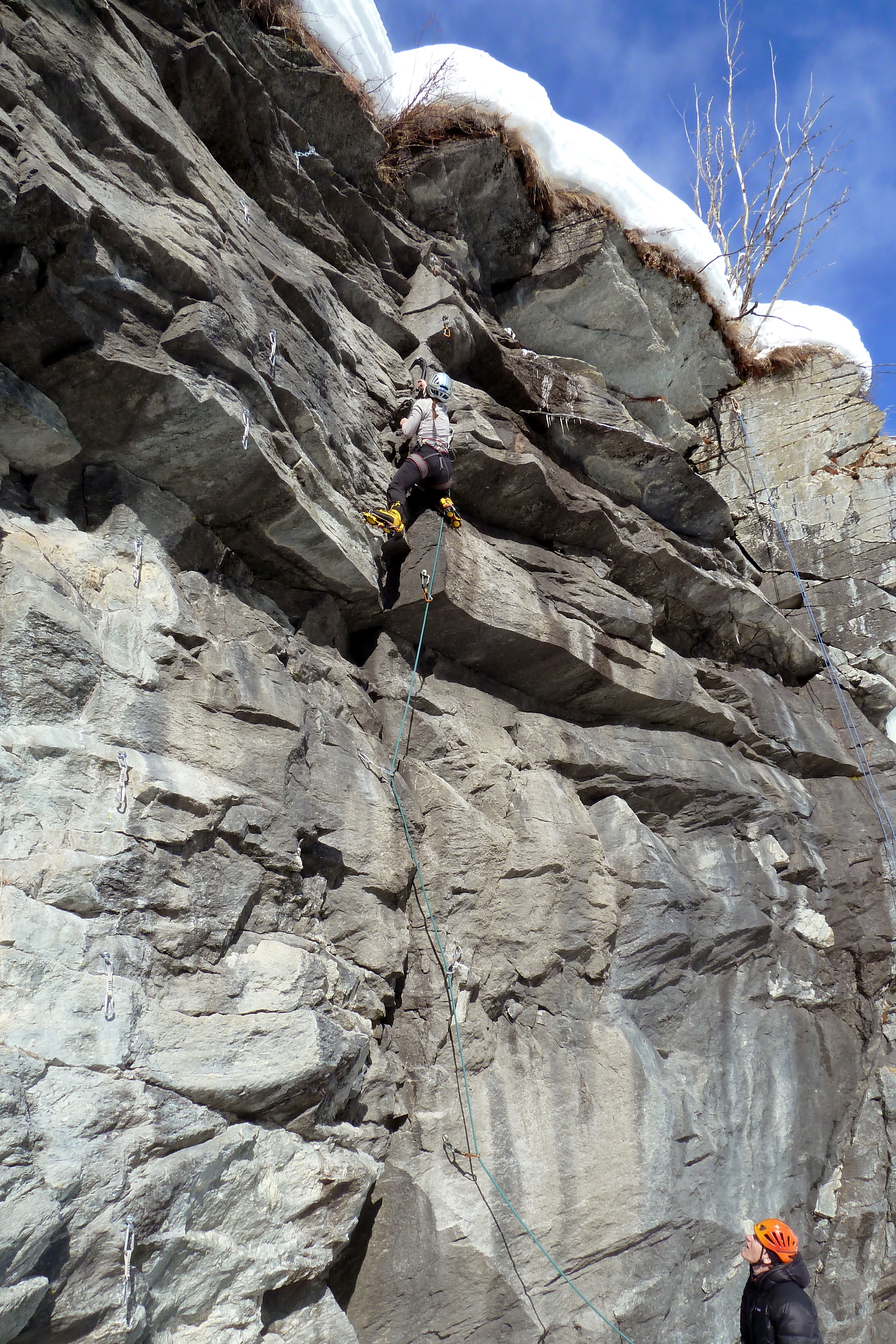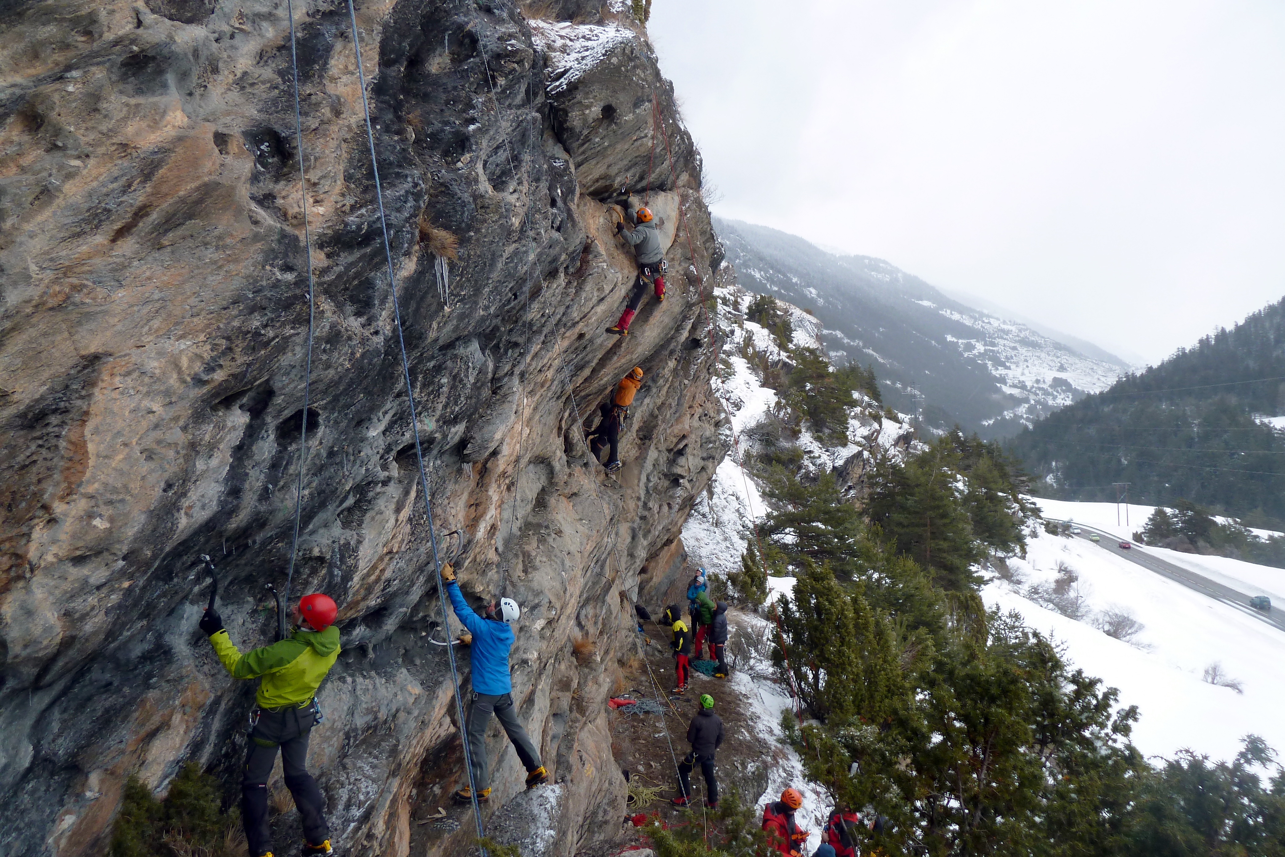 Ce site est parfait, il propose plusieurs voies pas trop difficiles ni trop longues avec des prises naturelles, des trous, plus ou moins indiqués mais aussi des voies difficiles et longues ! Beaucoup d’équipes espoir et promotion étaient présentes, la plupart n’avaient jamais ou peu fait de dry-tooling.