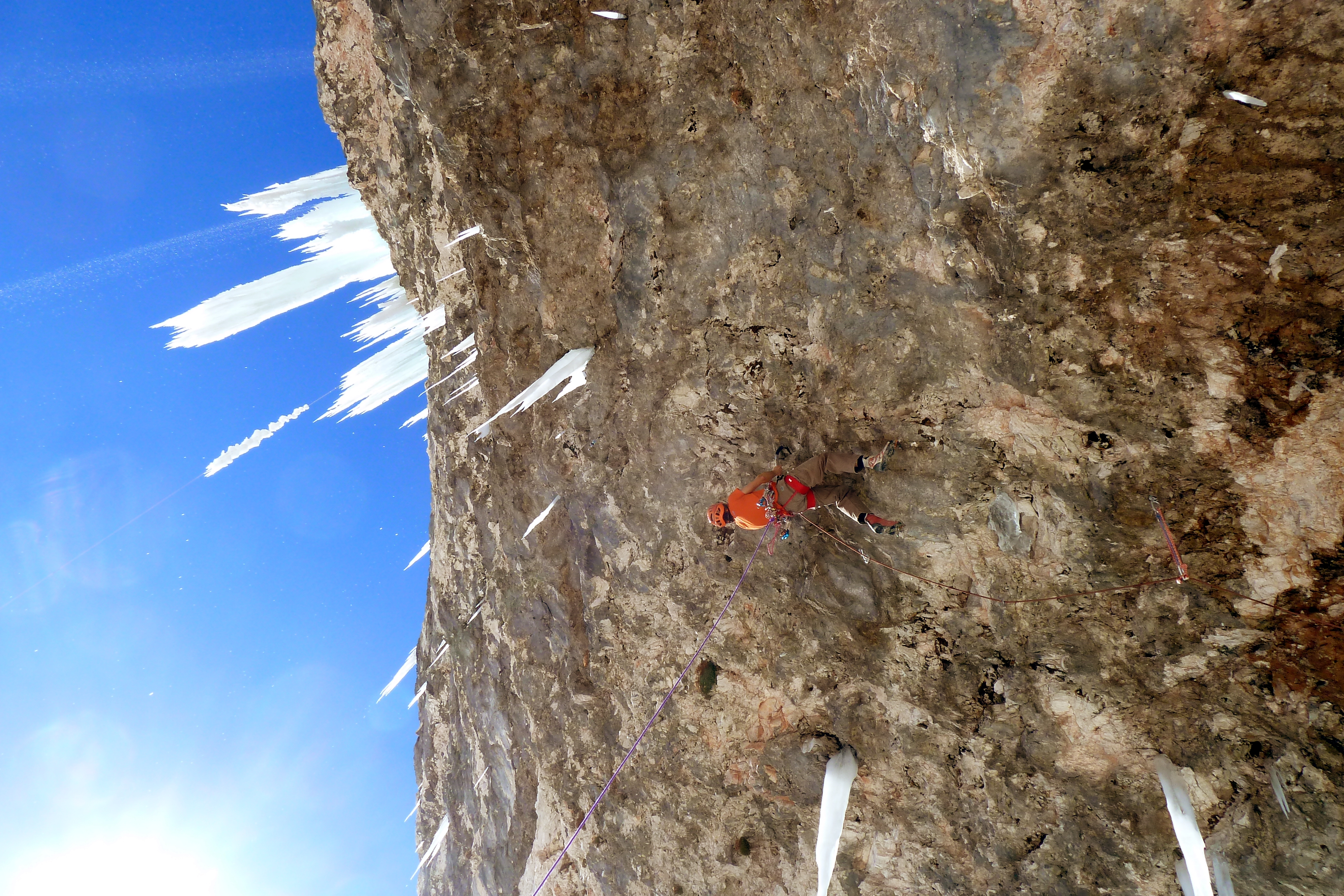 L1 : 50m, M9 pas facile qui réveille bien les bras ! Départ en dry sur quelques mètres pour rejoindre une stalactite qui mène à un gros bombé pas évident afin de sortir dans la glace.