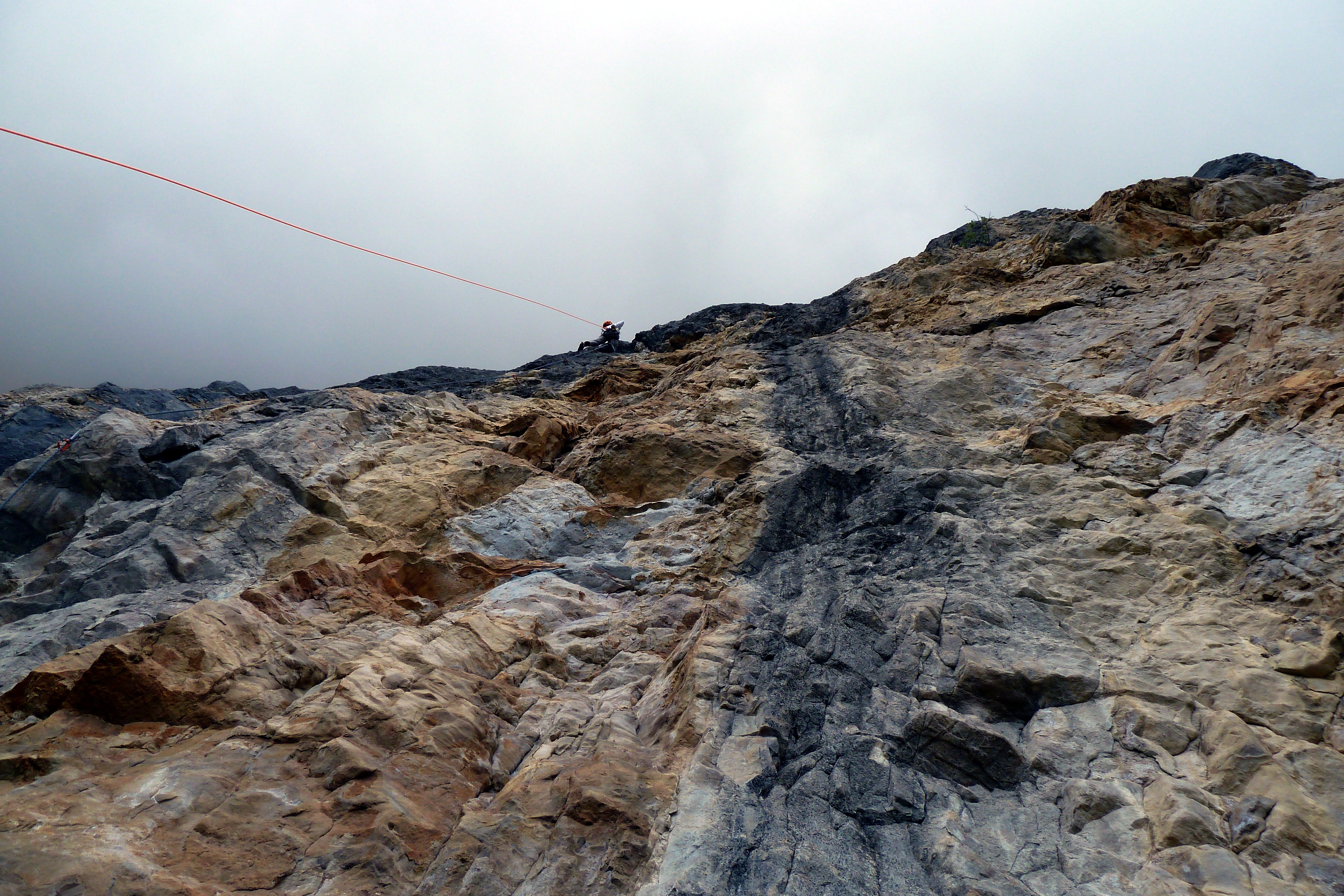 L4 : 7b+(c) Là on rentre dans le vif du sujet, un grand mur de crépis où il faut s’appeler Champollion pour arriver à le déchiffrer sans se mettre taquet. Trois gros combats en pur style « je me frotte de partout sur ce rocher scratch ! » Vraiment pas évident à vue, les pieds dérapent et les mais crispent d’infimes bouts de crépis tenant par miracle, de la grande varappe !