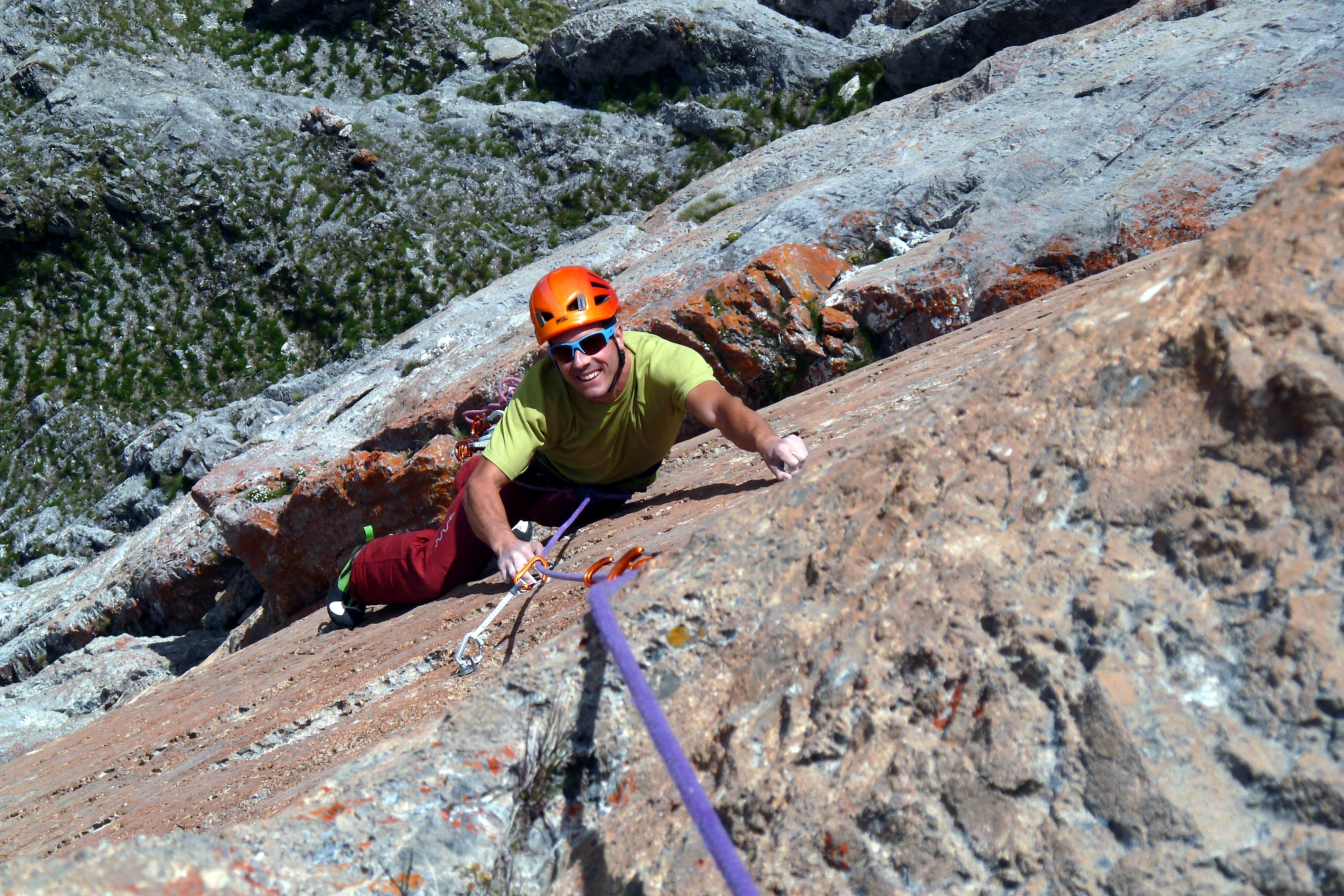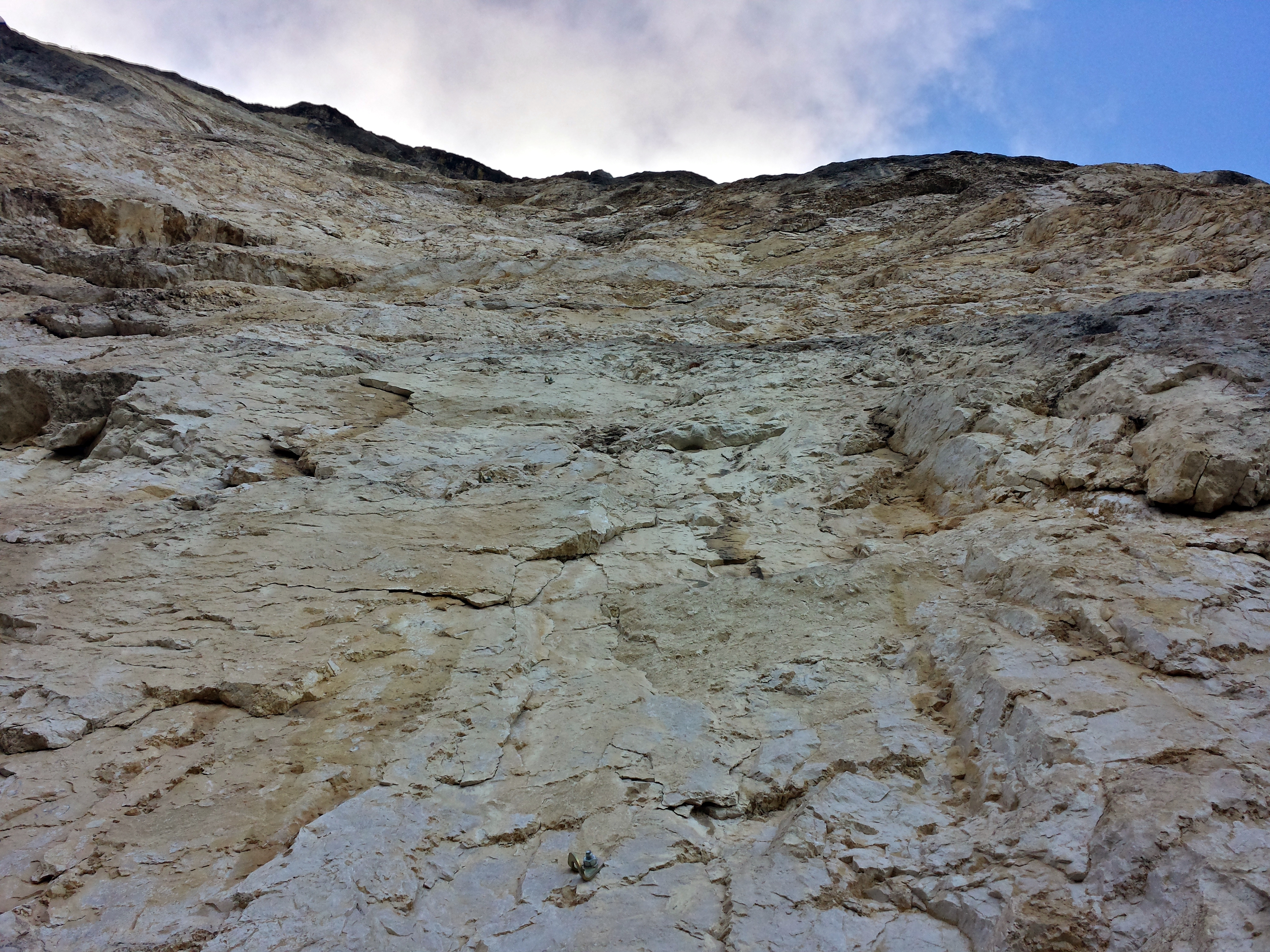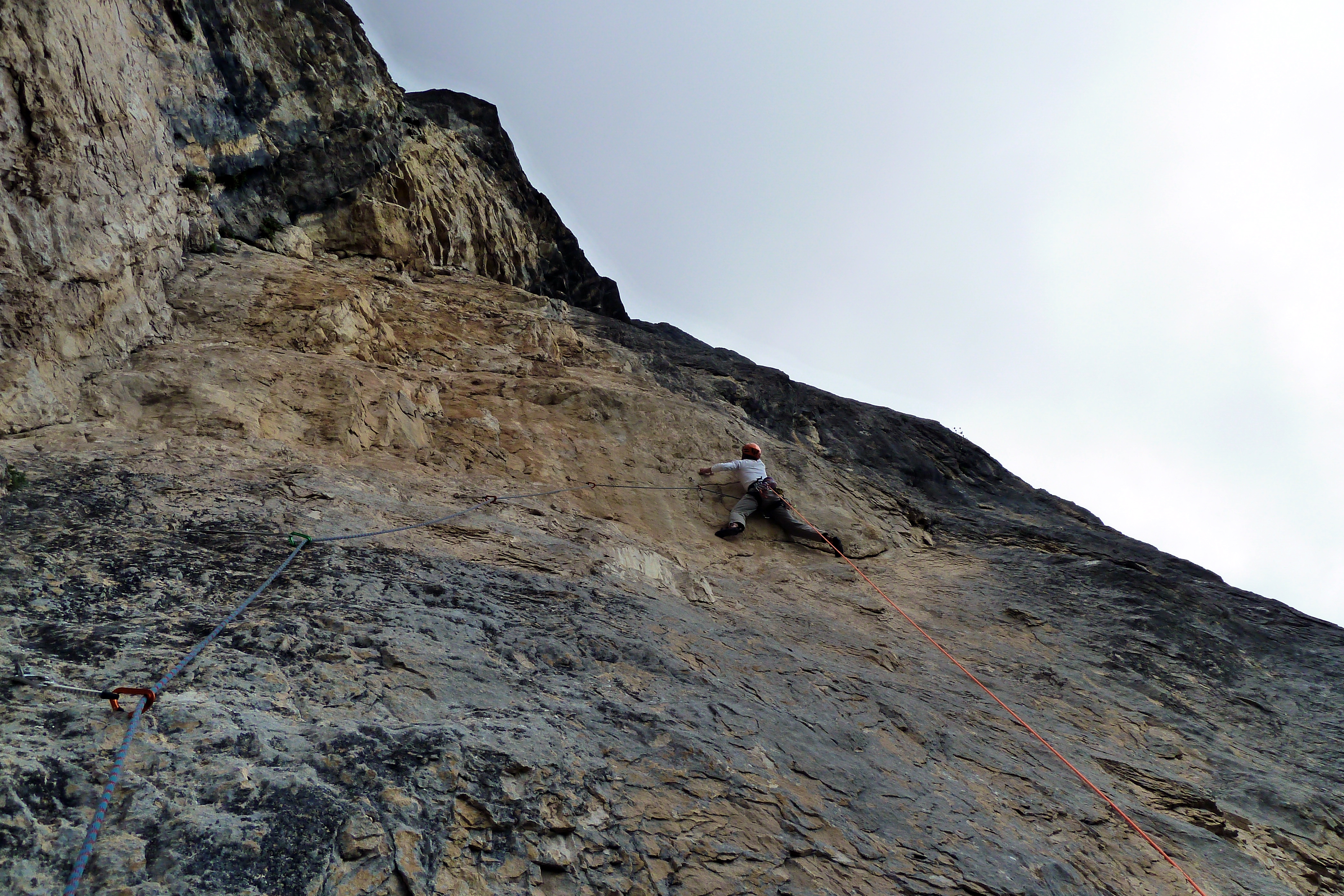 Jusque-là tout va pas trop mal, l’escalade n’est pas discount du tout et le rocher moyen ne permet pas une progression rapide. Les longueurs sont quand même pas mal. Il faut savoir mesurer chacun de ses mouvements pour choisir les prises solides tout en arrivant à lire suffisamment bien le rocher pour s’économiser au maximum pour la suite :