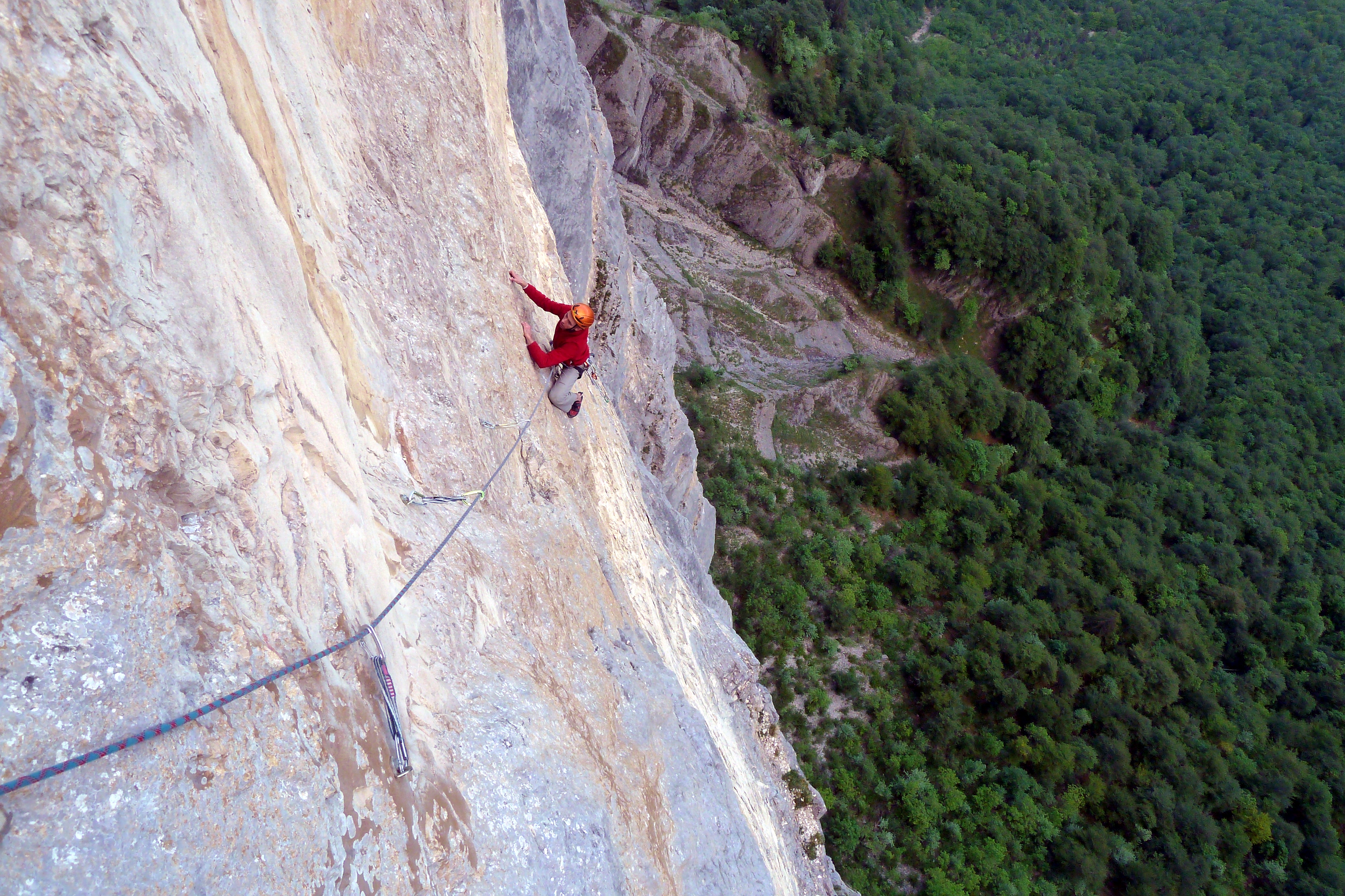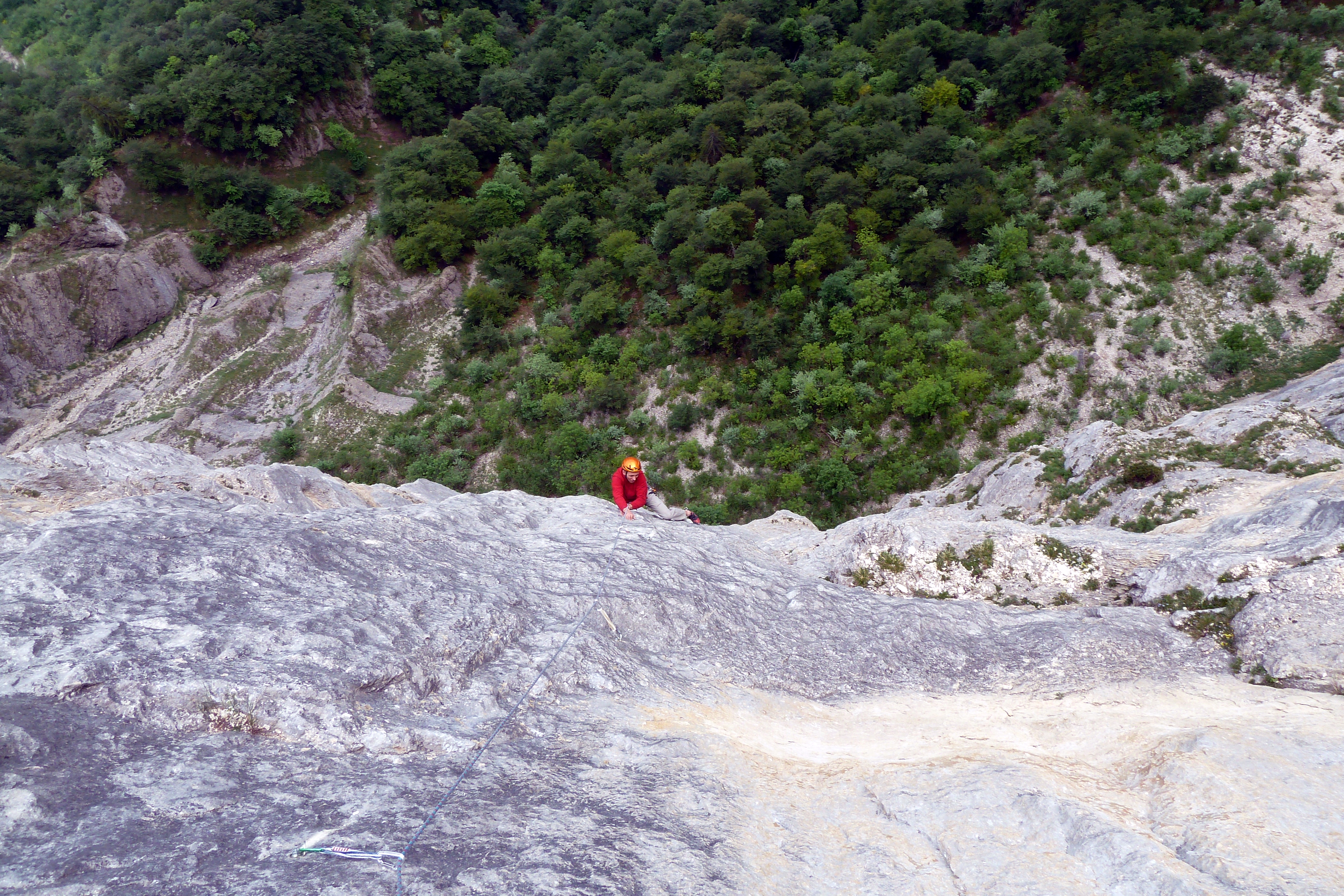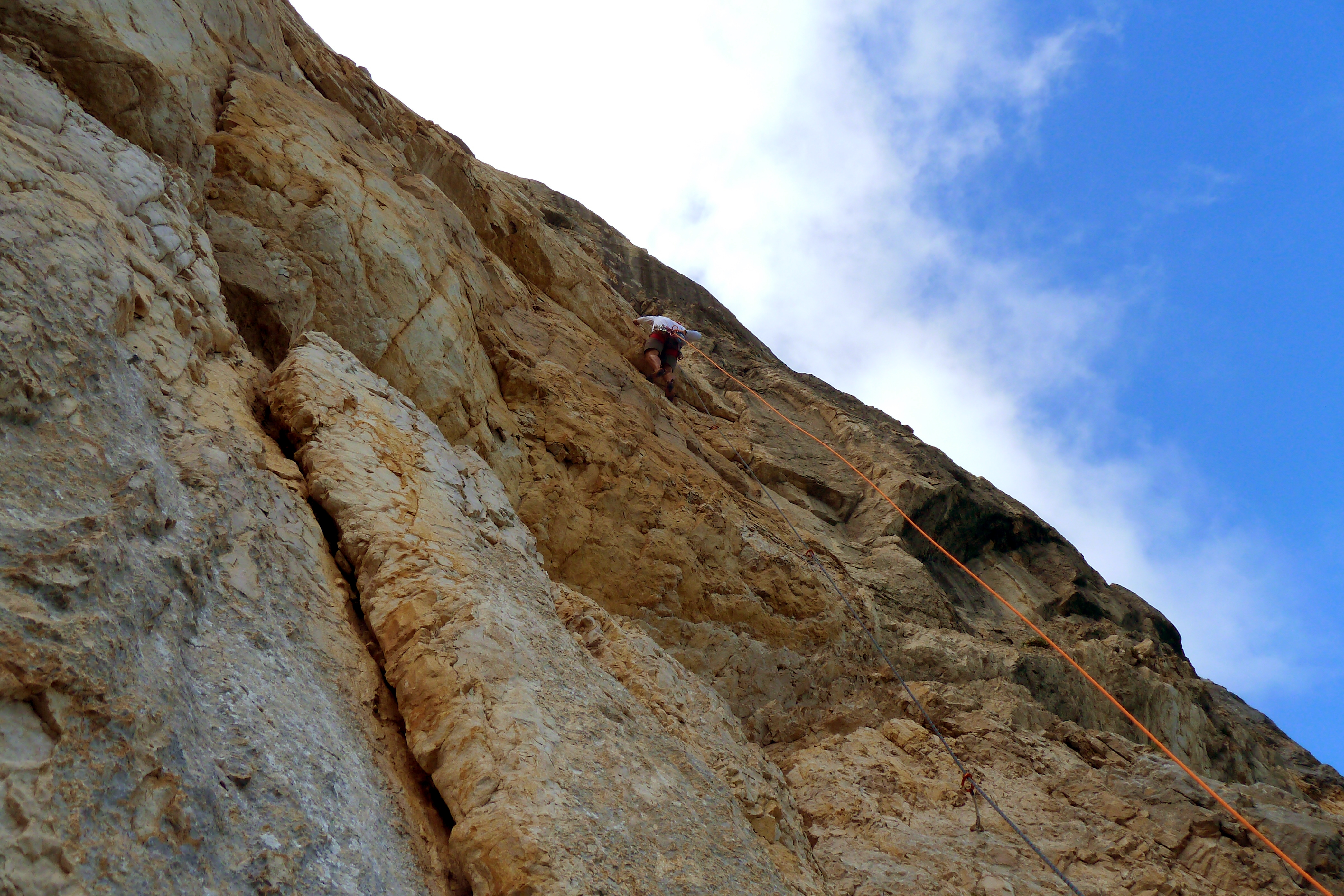 En bref, c’est la grande voie la plus soutenue que j’ai grimpé, il faut vraiment être au niveau des difficultés, déjà pour passer et ensuite pour se faire plaisir. La grimpe « à vue » y est très exigeante, il vaut mieux avoir l’habitude de ce style de grimpe : technique, très difficile à lire et soutenu dans les longueurs de 40m. Avec un peu plus de passage l’escalade deviendra vraiment tip-top mais là le crépis qui roule sous les pieds et qui craque sous les doigts ne rend pas la grimpe plus facile ! Le coin est super joli et paisible, idéal pour les chaudes journées d’été et l’accès en 15min par le camp des Rochilles ne vous donne plus d’excuses pour ne pas y aller !!