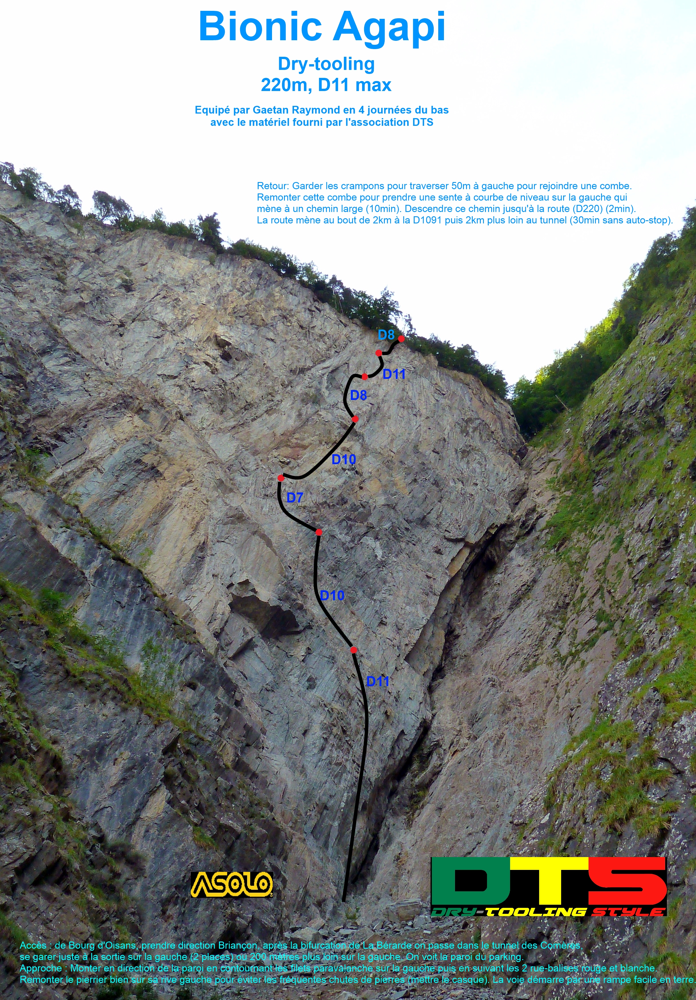 Accès : de Bourg d’Oisans, prendre direction Briançon, après la bifurcation de La Bérarde on passe dans le tunnel des Commères, se garer juste à la sortie sur la gauche (2 places) ou 200 mètres plus loin sur la gauche. On voit la paroi du parking.