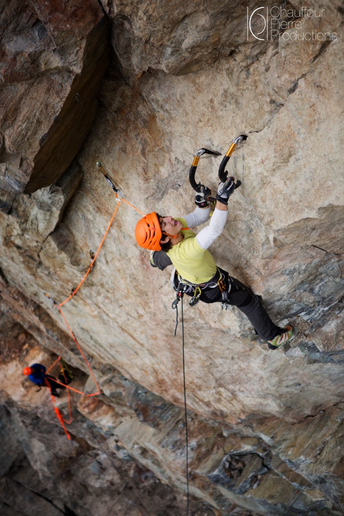 Ouvrir une grande voie c’est un sacré chantier, surtout en dry-tooling, du bas et tout seul… 4 jours passés à percer ce sacré rocher ultra-dur çà remet la forme pour le début de la saison de dry-tooling. Voici donc une grande voie de dry-tooling pas facile qui contre toutes les habitudes ne suit pas les lignes de faiblesses mais plutôt les lignes de forces. A chaque fois j’ai visé les murs les plus lisses et les plus déversants !
