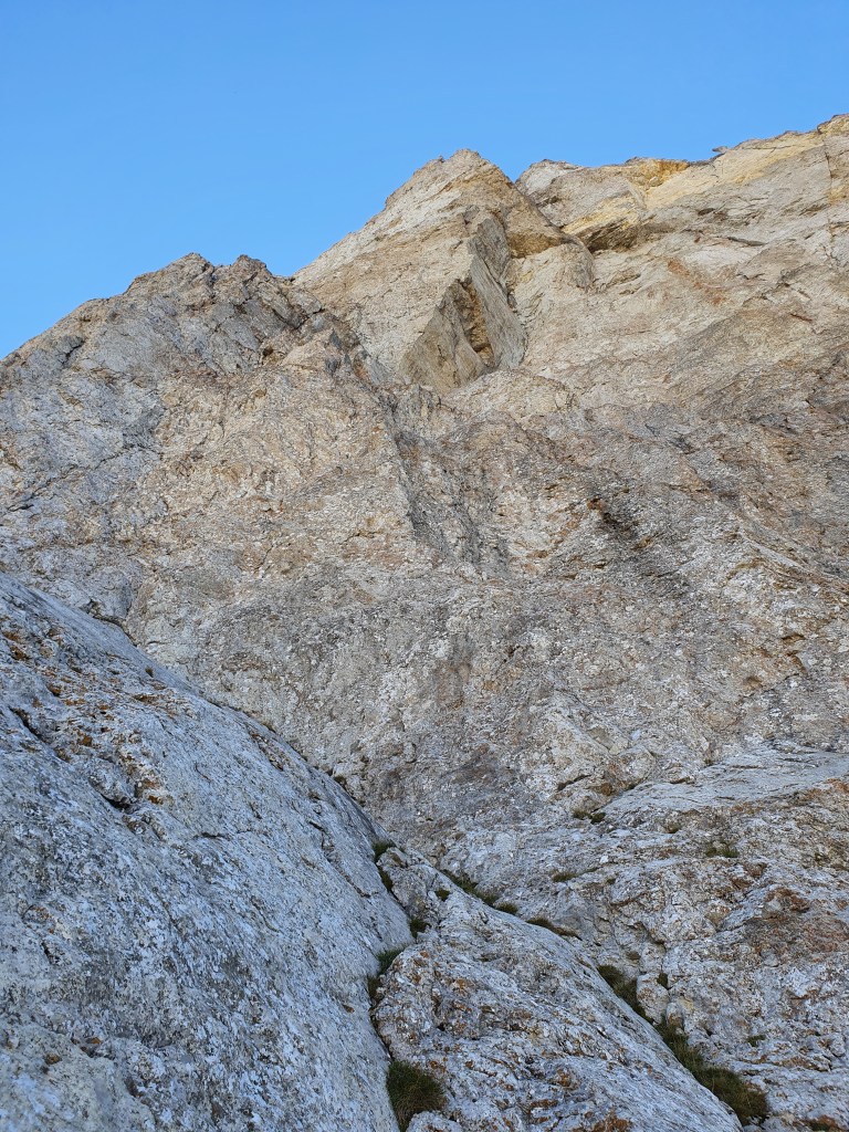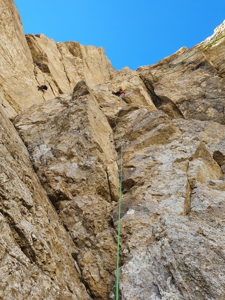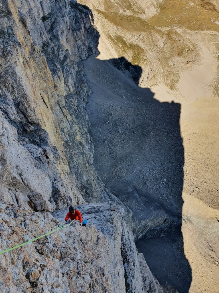 Grand pilier raide en rocher douteux, bien rester à gauche sur la fin.
