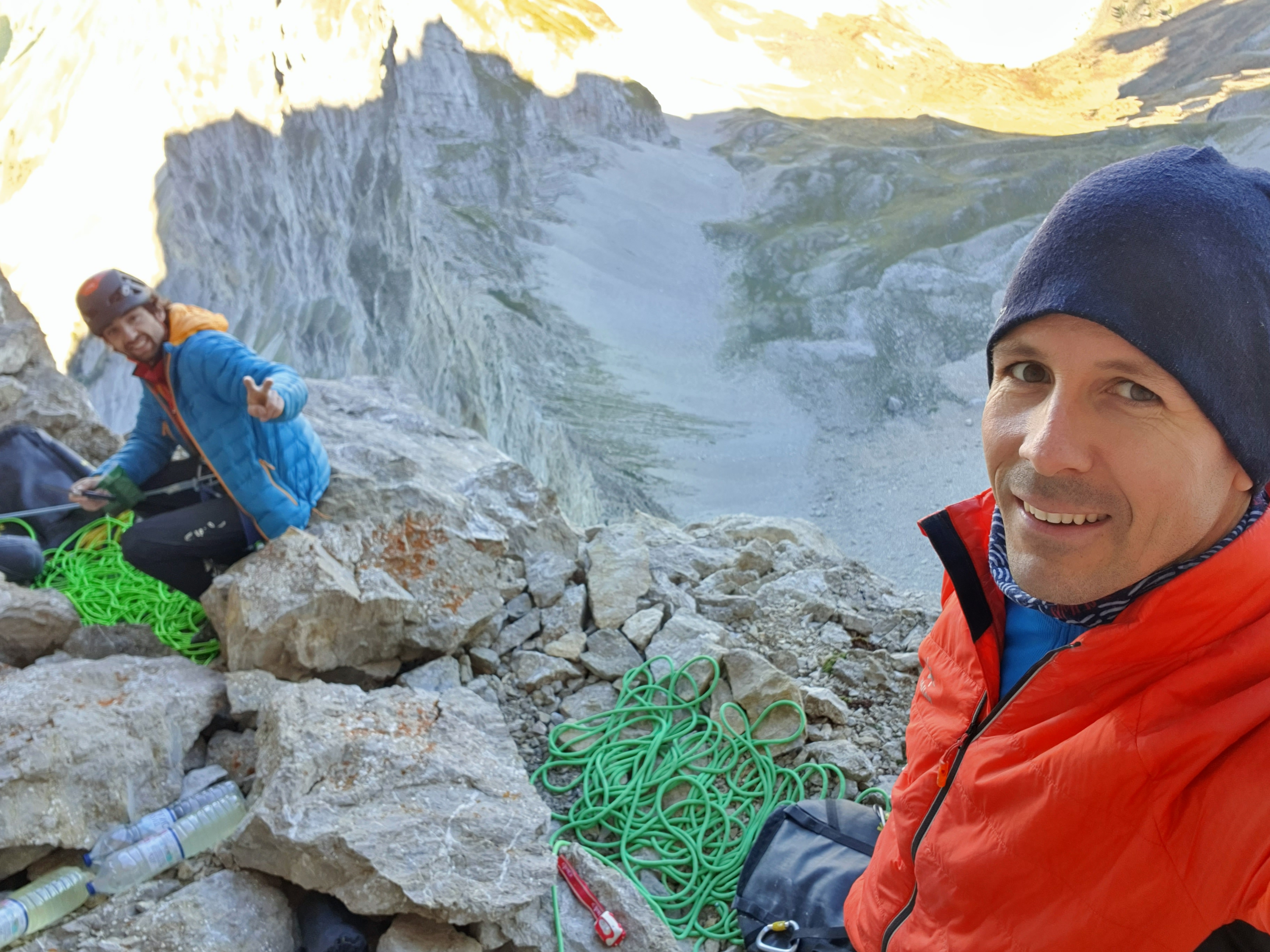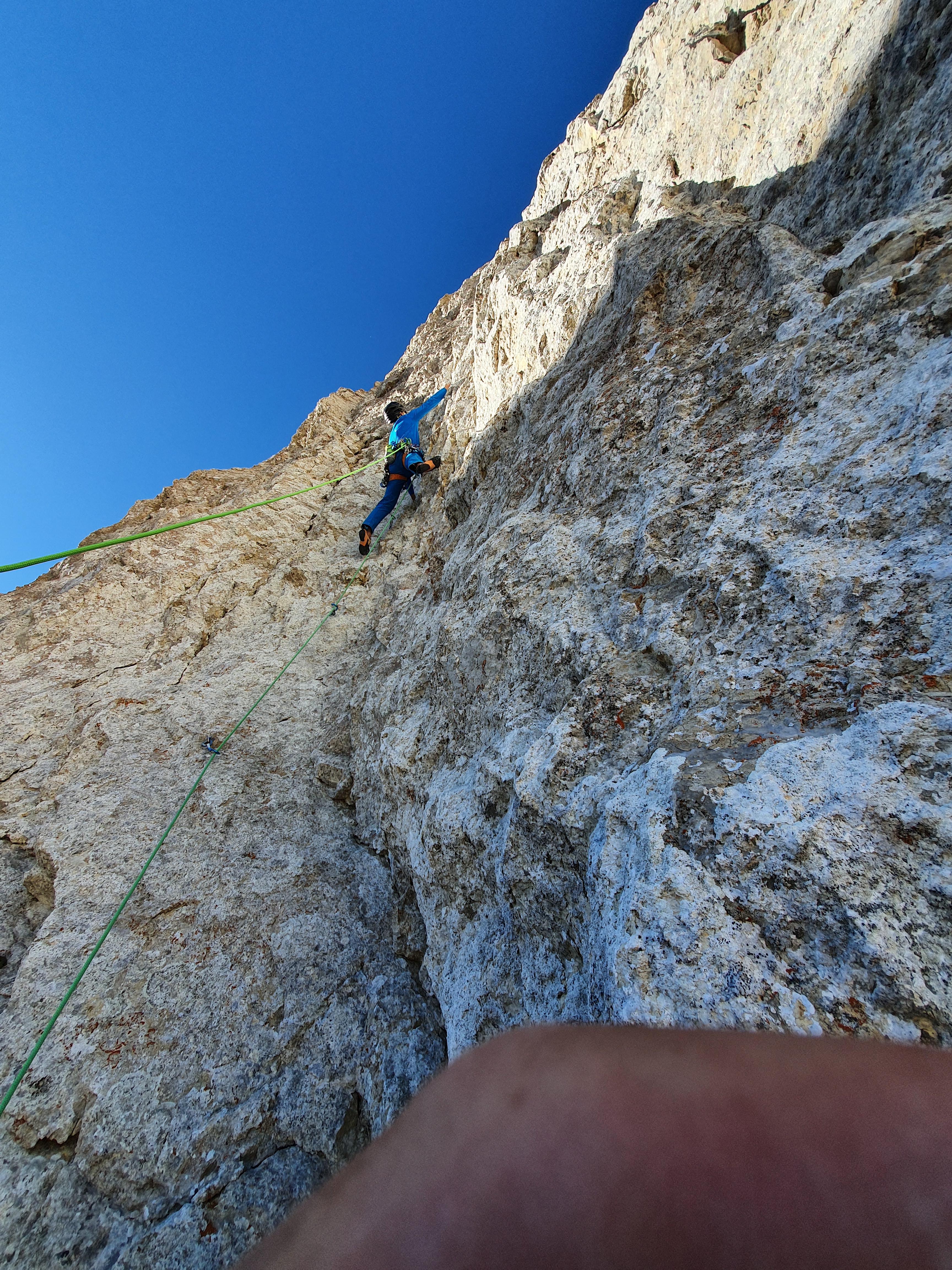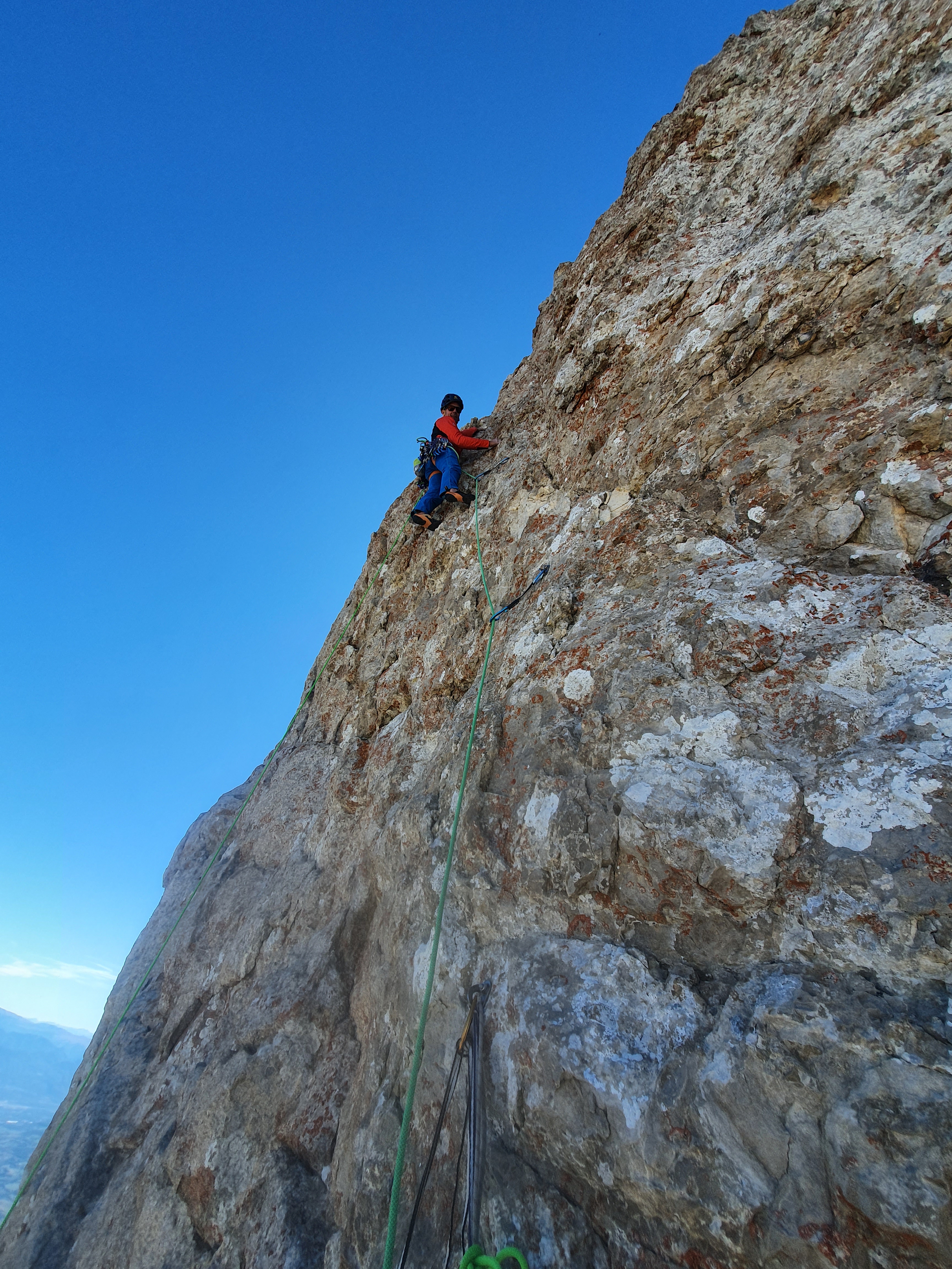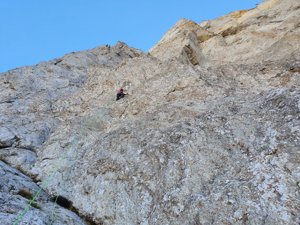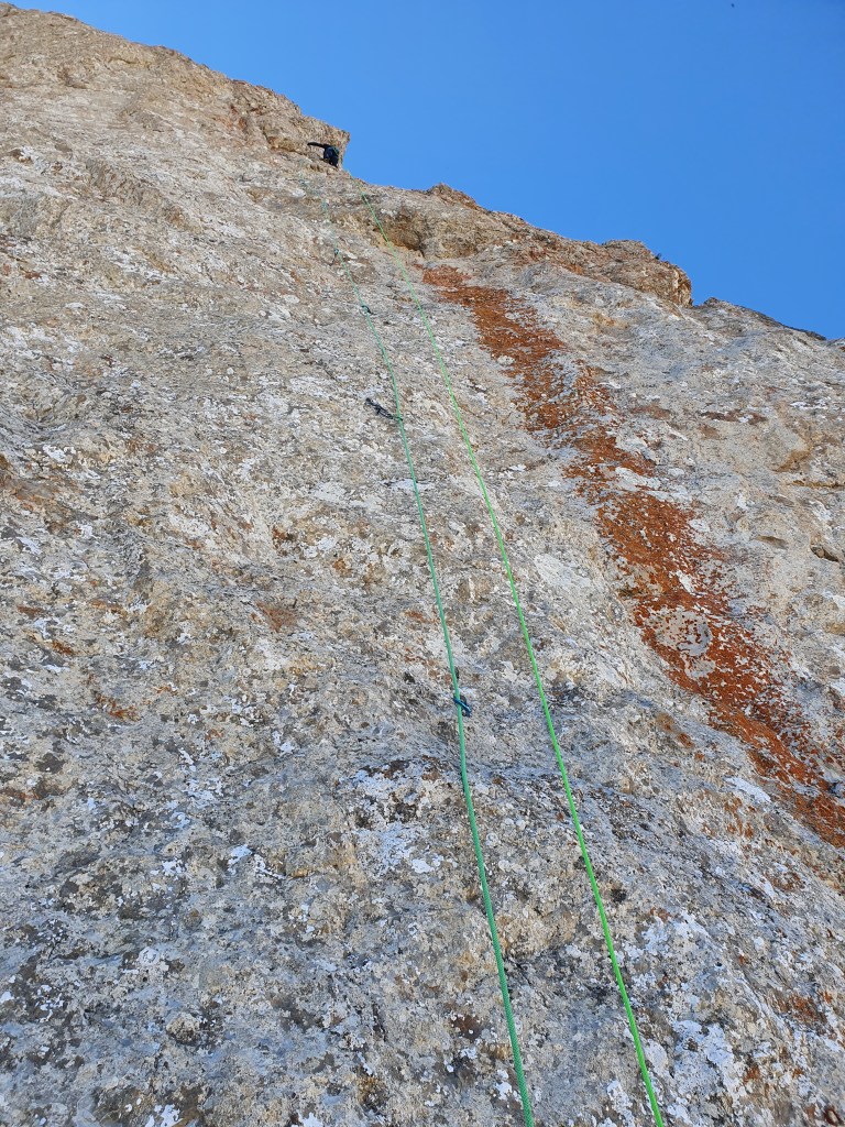 On tente le « à vue » en deux jours sans repérage, le temps est beau, frais et sans vent. Thomas, solide dans ce niveau aurait pu tout faire à vue sans soucis si ce n’est une malheureuse zippette dans L2 et une casse de prise dans L11, quant à L10 un micro bi-doigt invisible lui a couté hélas la croix dans cette longueur bien bloc que je remonterai bien à 7c+ et 7c obligatoire. Quant à moi, disons que 7c à vue en couenne est largement faisable mais là, sans traces et avec un rocher moyen ce n’était pas gagné ! Après m’être mis au taquet à l’échauffement pour enchainer la première longueur en 7c, j’enquille direct avec le 7c+ sans trop de repos et je craque à la fin… L3 8a, section pas évidente où bien fumé je perds l’équilibre dans le passage dur. L4 en 7c+, cramé physiquement je n’avais plus beaucoup de rési pour chercher les petites prises, gros combat. Après une longue nuit de repos, les deux longueurs dures se passent bien. Je tombe aussi dans la L10 en 7c au même endroit que Tom mais dur dur de faire la section, même avec la prise cachée… Le 8a qui suivra se passera plus facilement en ayant vu où passer grâce à ce solide Tom ! La suite, plus facile sur le topo n’est pas à négliger tout de même avec un caillou demandant de l’attention et de l’itinéraire.
