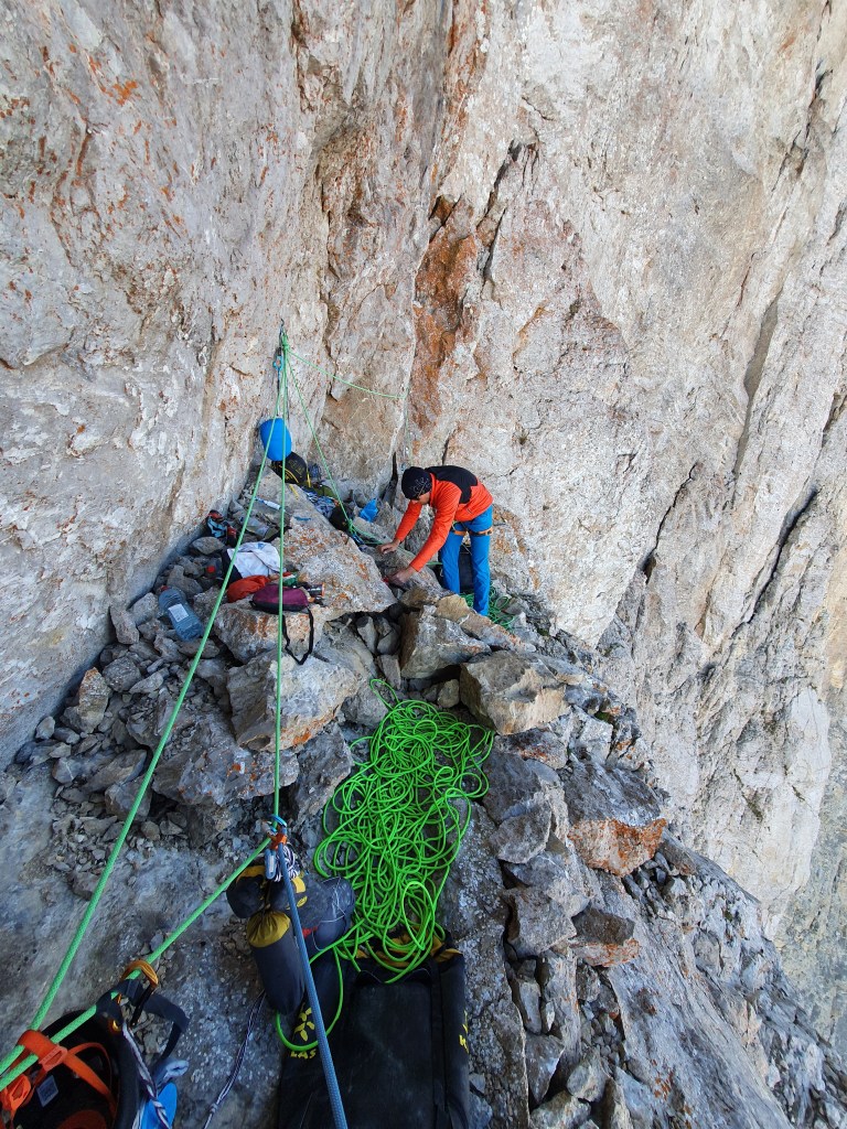 Possibilité de plus grand bivouac plus à droite sur le sommet de l’éperon, accessible par le relais suivant.