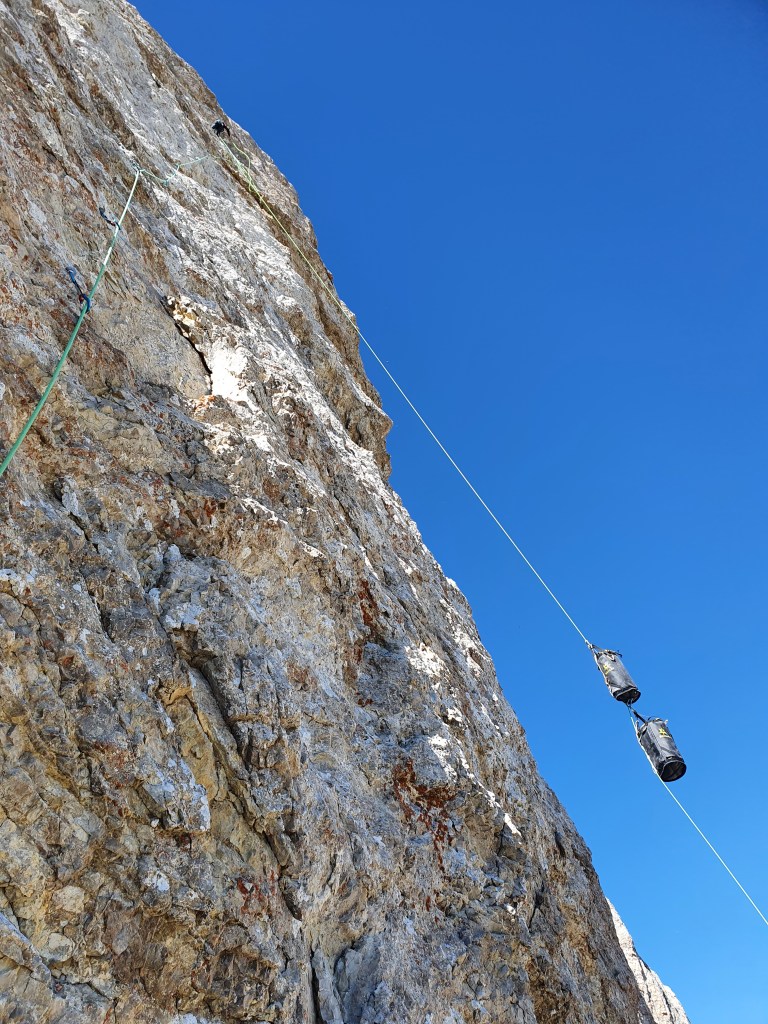 - Corde hissage 60m gully, avec 70m çà permet de hisser le premier sac tout seul jusqu’au relais puis le deuxième à deux