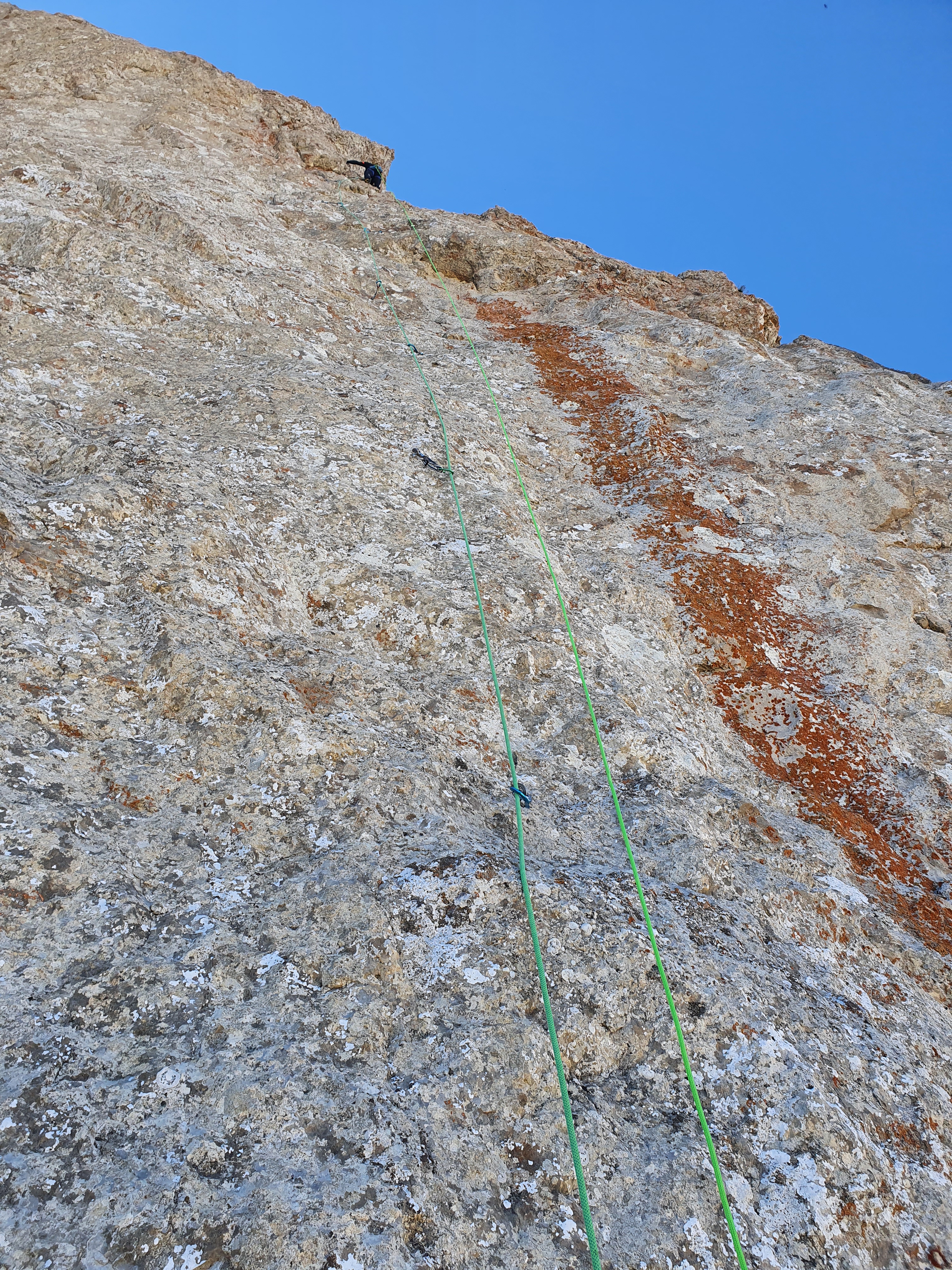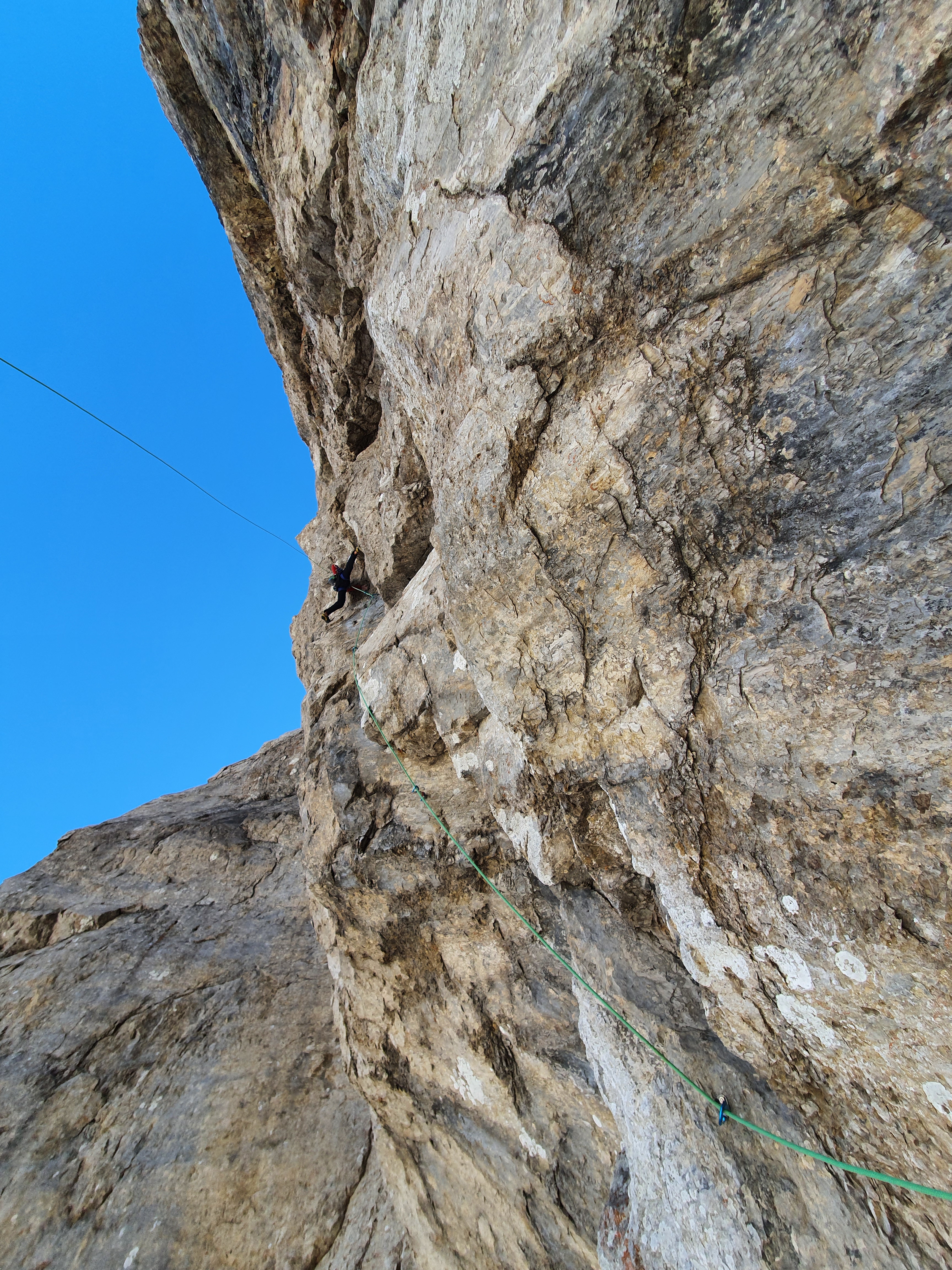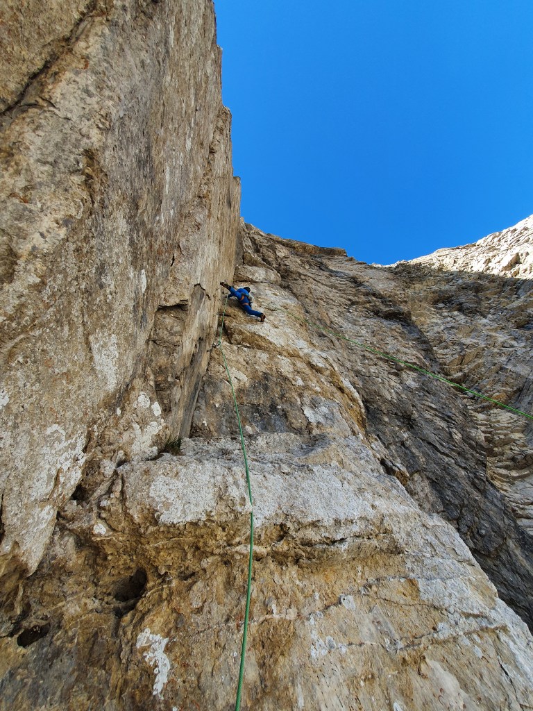 Une belle grande longueur bien raide en rocher parfois moyen.