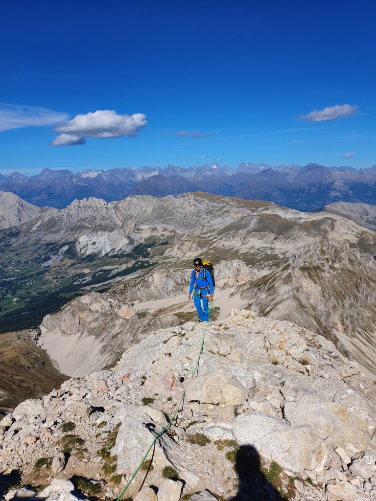 Sortir au sommet par l’arrête, 120m de corde tendu ou relais sur un spit à 60m.