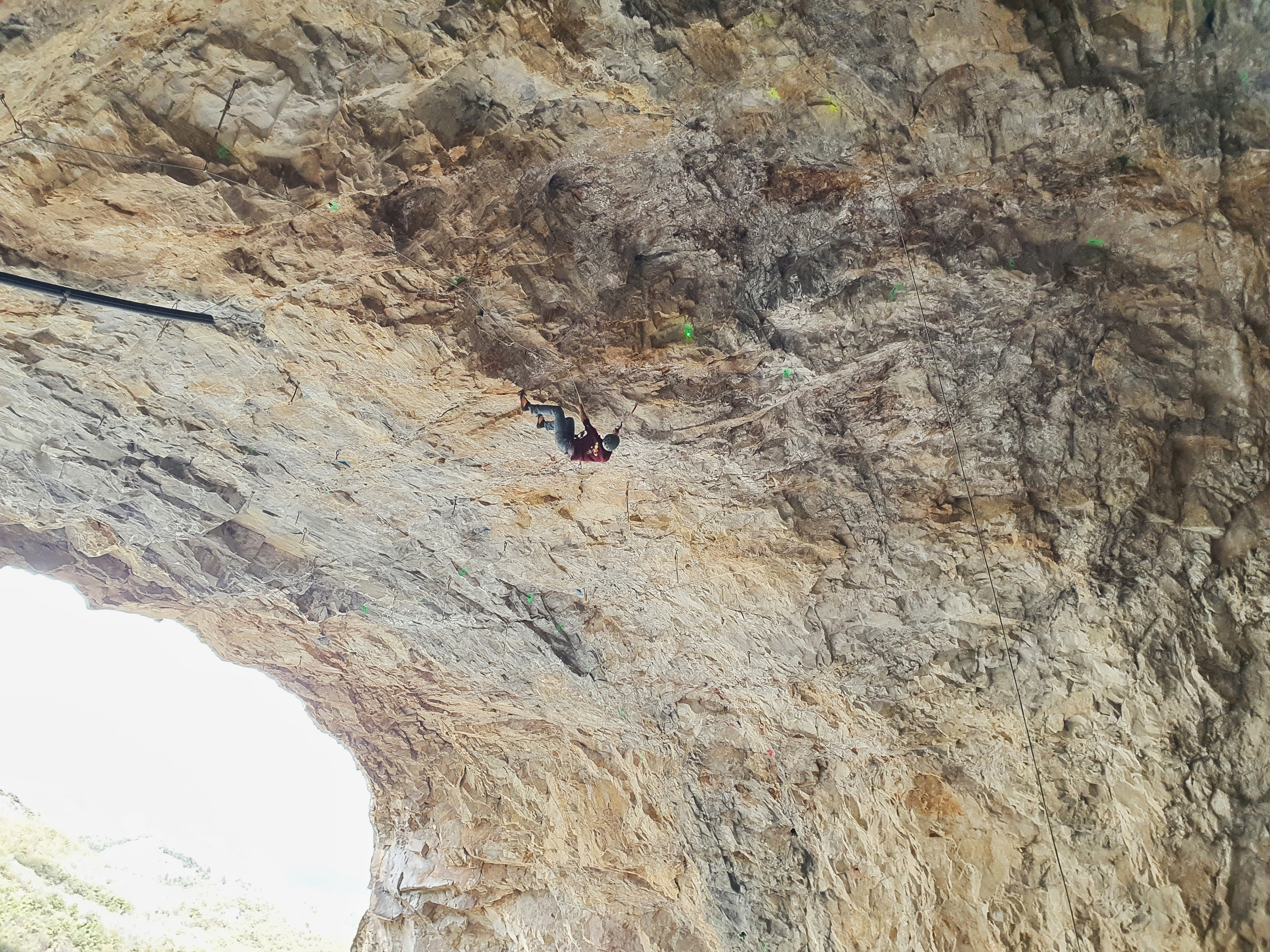 Le style est vertical au départ pour rejoindre le toit, des voies pas forcément longues mais vraiment physiques dans ce toit !
