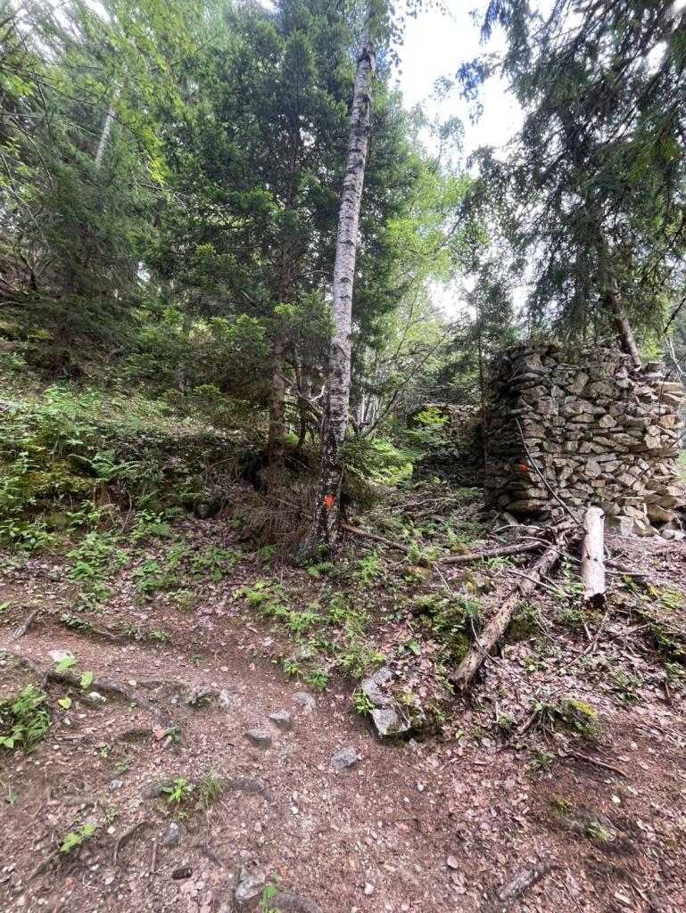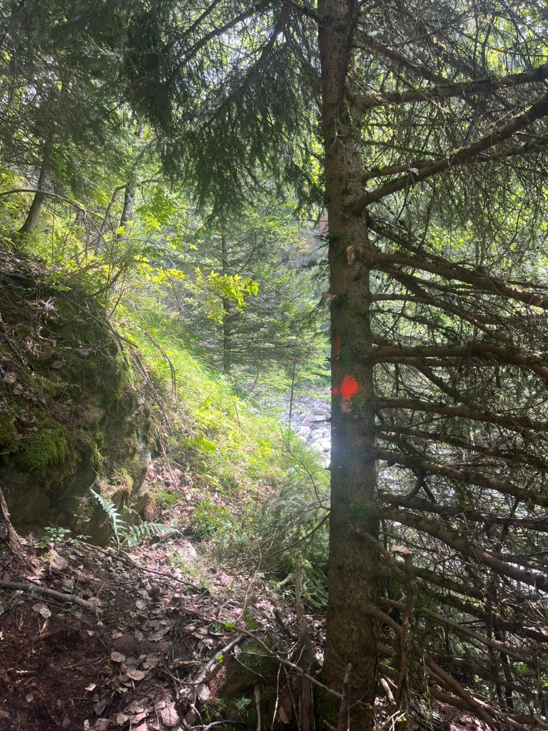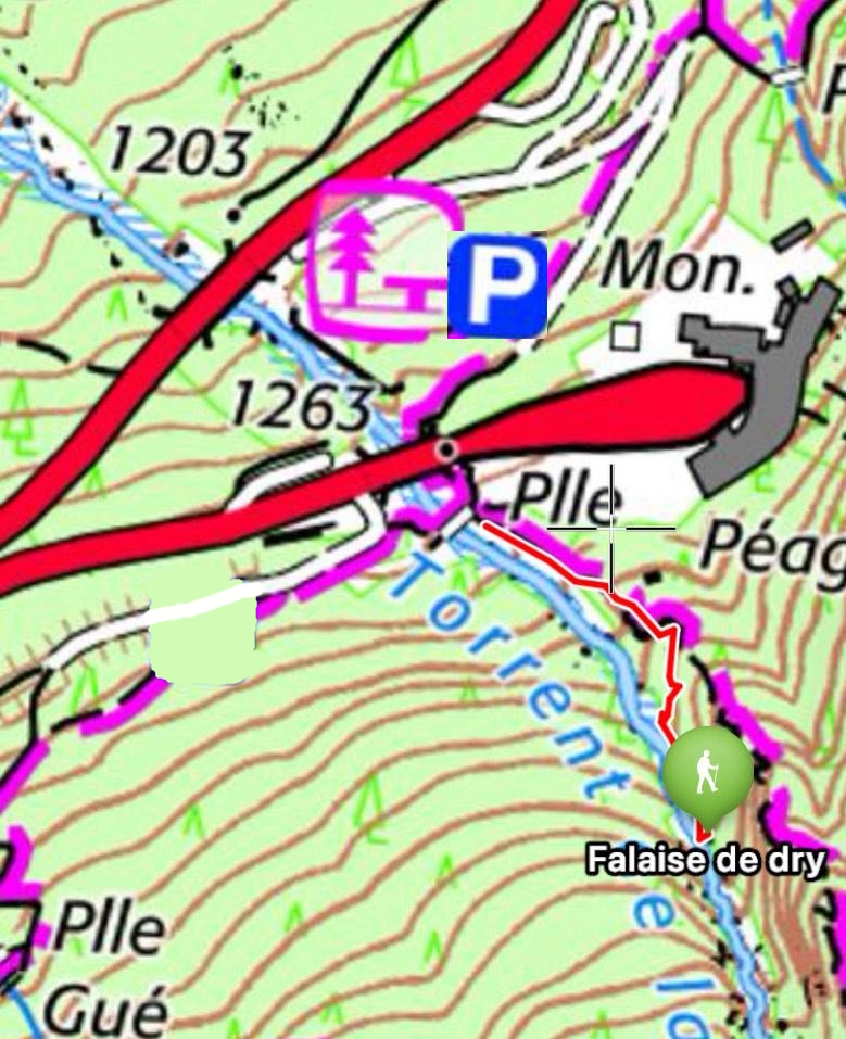 Au bout du parking, prendre le chemin « Gare de la Para » qui passe sous la route. A la première épingle, quitter ce chemin à droite entre l’arbre et la ruine en suivant les points orange. La sente mène à la rivière avec une main courante puis remonter la rivière pour arriver au pied de la falaise (corde).